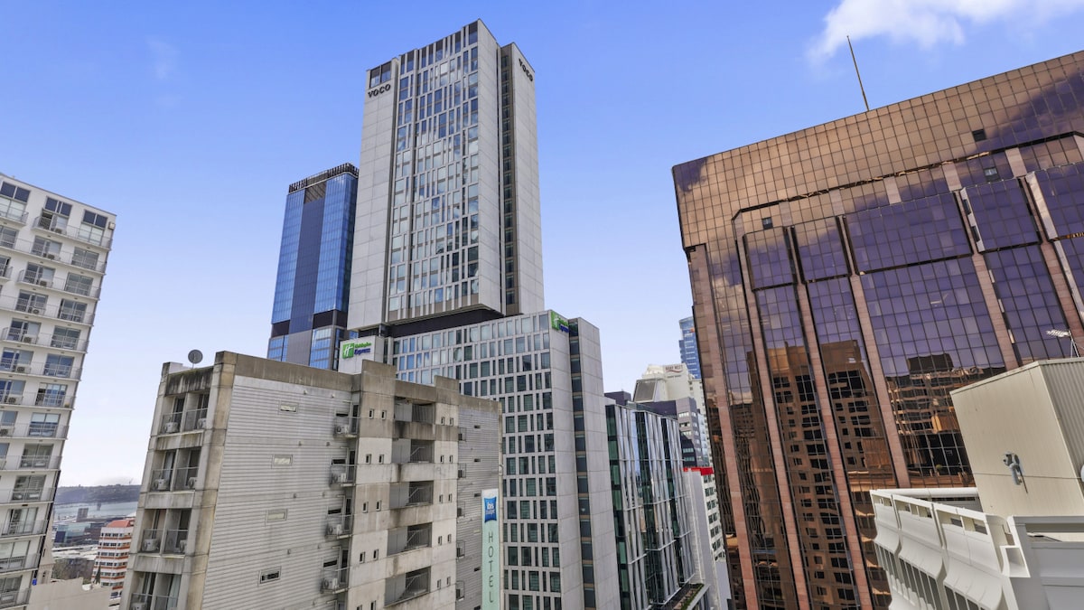 Studio élégant et relaxant situé au centre. Profitez du séjour avec accès à la salle de sport intérieure et à la piscine extérieure, où vous pourrez profiter d'une vue imprenable sur la SkyTower et le parc. Lit Queen Size super confortable, coin repas et salon ouverts. Une porte coulissante à double vitrage du sol au plafond avec un balcon gardera la ville animée à l'extérieur. Cuisine entièrement équipée et buanderie, WiFi illimité, télévision connectée, draps et serviettes de haute qualité. À quelques pas de Skytower, du ferry, de la gare, de l'université, des bars et des restaurants.