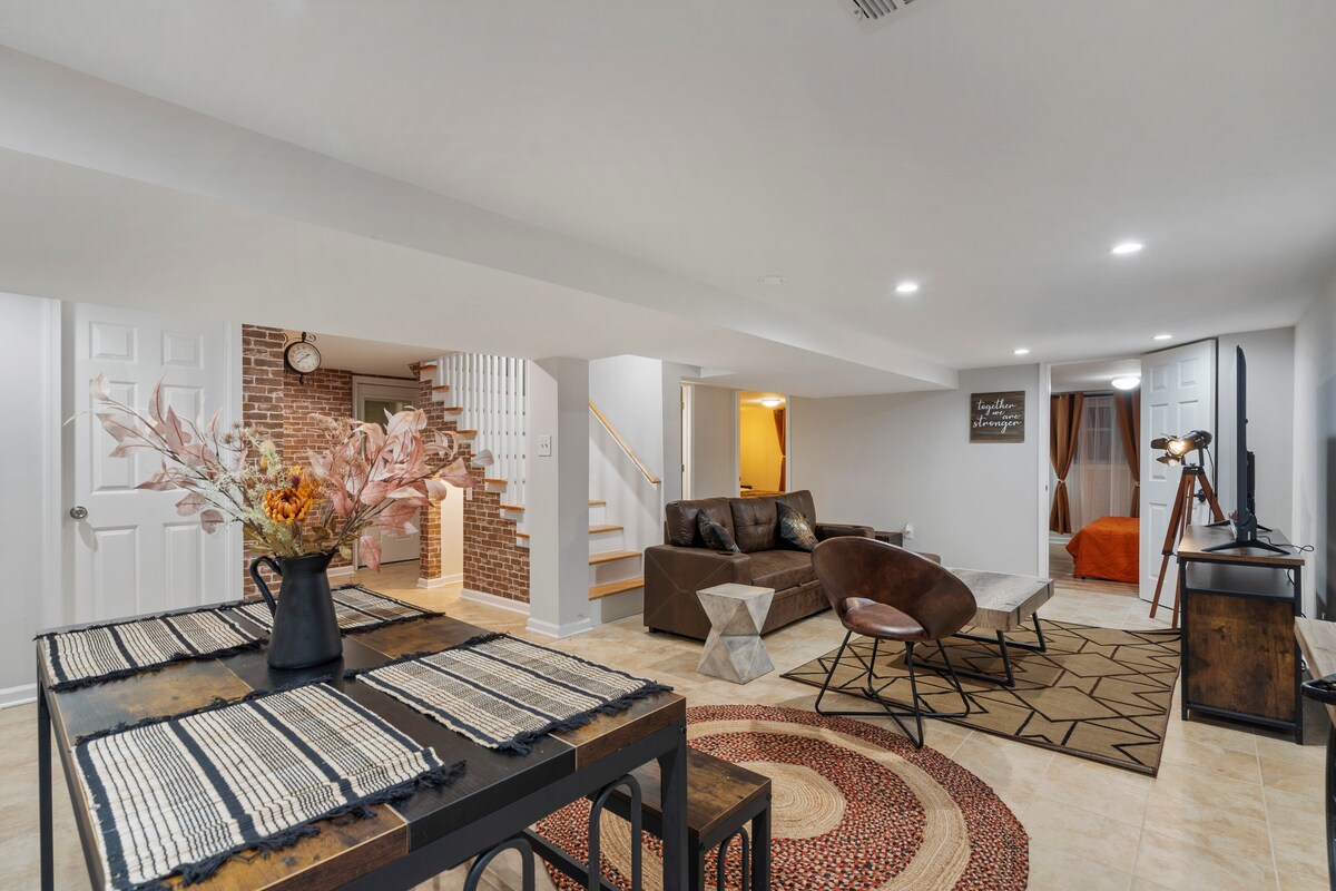Les familles qui visitent Washington, D.C. adorent rester chez nous. Notre emplacement est à seulement vingt minutes en voiture de toutes les principales attractions. Une place et une station de bus à quelques pas, offrant de nombreuses options de restauration et d'épicerie. 3,4 miles de la station de métro. Cet appartement privé et spacieux de 1 600 pi2 au sous-sol dispose d'une entrée séparée, d'un stationnement gratuit dédié et d'espaces de vie extérieurs accueillants. C'est un endroit confortable où vous vous sentez comme chez vous. Les hôtes résident tranquillement sur les deux niveaux supérieurs.