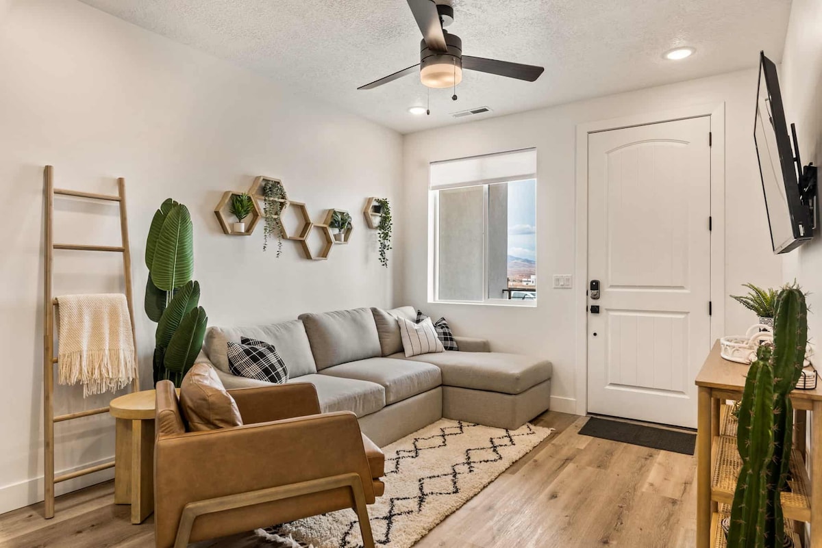 Séjour confortable et propre ! À 11 minutes du Snow Canyon State Park, à 10 minutes de l'amphithéâtre Tuachan ! Pas loin du parc national de Zion. 1ère chambre : lit Queen Size, placard, coin lecture, espace de rangement supplémentaire. 2ème chambre : lit Queen Size/lits superposés. Salle de bain : baignoire/douche, lave-linge/sèche-linge. La cuisine est petite mais pratique : réfrigérateur, évier, four grille-pain, micro-ondes, plaque chauffante, kurik, etc. Séjour : canapé inclinable, chaise pivotante, télévision connectée, foyer électrique et bureau/miroir. *mise à jour* ~ eau chaude instantanée !