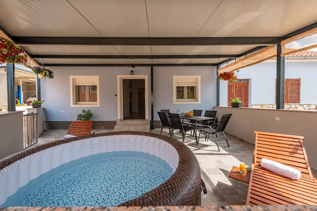 Nestled in the peaceful village of Banjevci, this charming holiday home offers the perfect escape. The house features three cozy bedrooms, two modern bathrooms, and a stunning terrace with a private jacuzzi, ideal for relaxing after a day of exploring. Just a short drive away is the famous Kamenjak viewpoint, offering a breathtaking panoramic view of Vrana Lake. With warm and welcoming hosts dedicated to making your stay special, this home is your gateway to the best of Dalmatia’s nature."