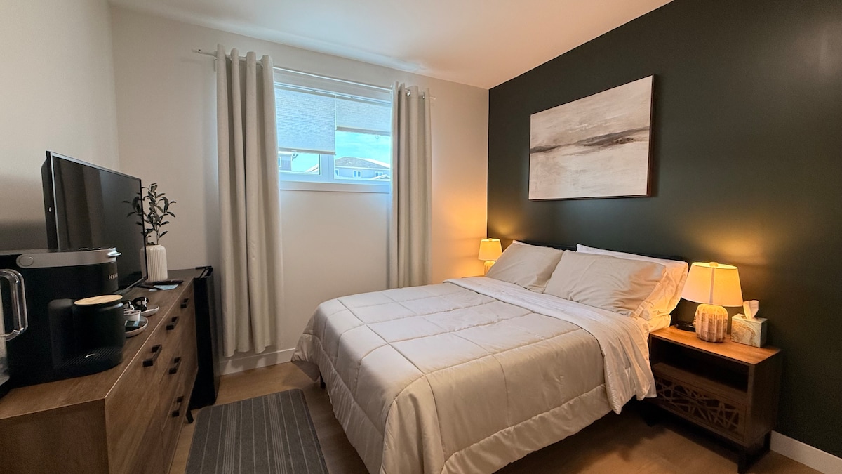 Small but mighty, this compact Winkler suite offers style, convenience, and the perfect balance for your stay. This cozy studio is thoughtfully designed to offer everything you need for a relaxing stay, all within a clean, modern, and intelligently organized layout. What You’ll Love: ✔ Private entrance ✔ 3-Piece Bathroom ✔ Fully Equipped Kitchenette ✔ Comfy Double-Size Bed ✔ Smart TV ✔ Modern Lighting & Clean Design ✔ Convenient Location