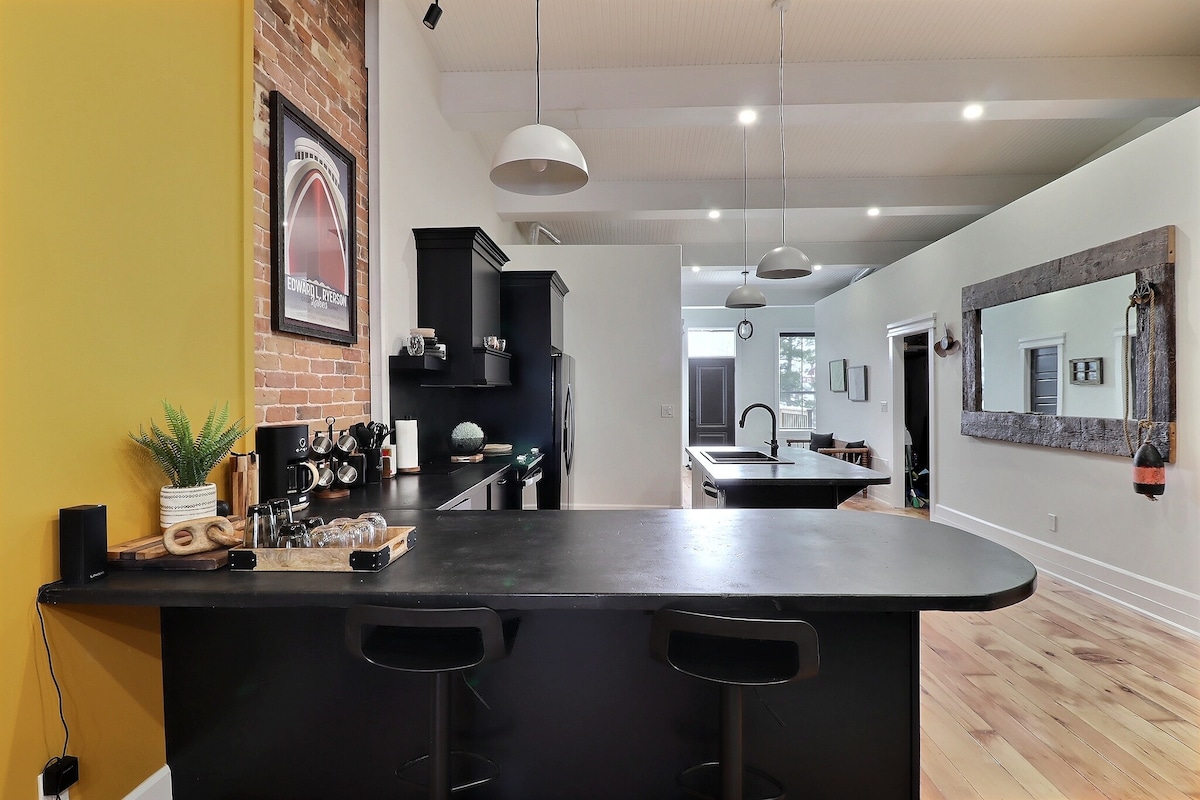 Séjours de mi-saison de novembre à juin. Suite de 1 chambre à thème nautique, luxueuse et romantique. Profitez de votre propre espace de 1100 pieds carrés au centre-ville de Prescott (1 pâté de maisons de la rivière). Avec un design industriel et moderne, cet espace met en valeur l'art unique et personnalisé, la littérature et une vue partielle sur la rivière. REMARQUE : l'accès au logement se fait uniquement par les escaliers extérieurs. Ce logement est au 3e étage et n'est pas recommandé pour les personnes qui peuvent avoir du mal avec les escaliers ou les hauteurs.