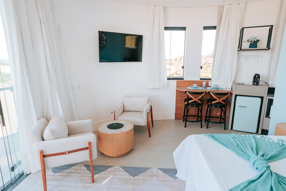 CHALET VIOLET IPÊ - Suite 1 ou 2 *Suite avec lit Queen Size, minibar, smart TV LED 43", climatisation chaude/froide, wifi, balcon privé donnant sur Pedra Menina et parc national de Caparaó et cheminée écologique. À partager : Salle vitrée avec terrasse décorée avec 2 beaux fauteuils en corde nautique, table ronde avec 4 chaises en cuir confortables, cafetière électrique, moulin à café, sandwicherie et micro-ondes. 600 R$ / nuit *Arrivée de 14h à 21h Départ jusqu'à 12h