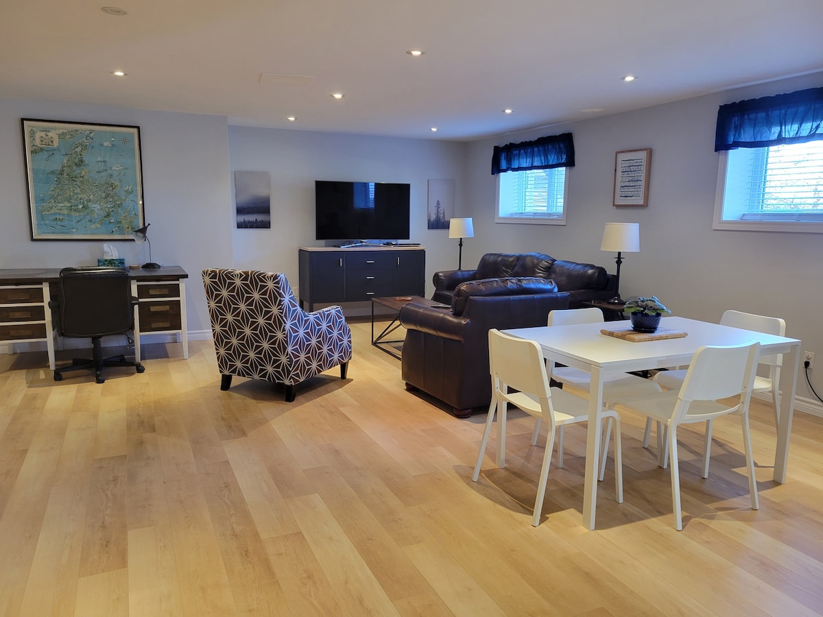 Suite confortable et spacieuse d'une chambre avec lit Queen Size, salle de bains privée, entrée séparée, beaucoup d'espace pour le salon privé, elle dispose d'un micro-ondes, d'une bouilloire, d'un grille-pain, d'une cafetière et d'un réfrigérateur de grande taille (pas de cuisine, pas de cuisinière). Télévision avec Netflix, YouTube, Wi-Fi. Stationnement dans l'allée disponible. Les animaux sont limités. Accès facile à l'autoroute, à 5 minutes en voiture du nouvel hôpital et du campus Grenfell, à 10 minutes des commodités. À 1,5 heure en voiture du parc national du Gros-Morne, à 40 minutes en voiture de l'aéroport de Deer Lake, à 2,50 heures du traversier.