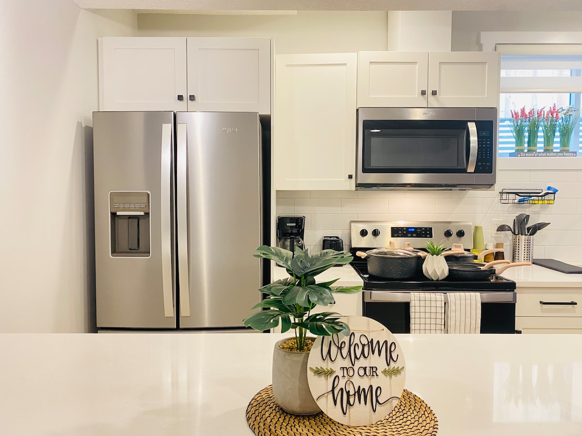 Détendez-vous dans ce tout nouvel espace élégant au look zen ! Profitez du mur de fonctionnalités qui s'allume et offre une expérience zen. Nous sommes situés à 6 minutes du célèbre West Edmonton Mall, à 15 minutes du centre-ville et de l'Université de l'Alberta ! Nous sommes également à quelques minutes du terrain de golf Lewis Estates et du casino Rivercree ! Nous serions ravis de vous inviter à séjourner ici. Réservez votre séjour chez nous aujourd'hui !