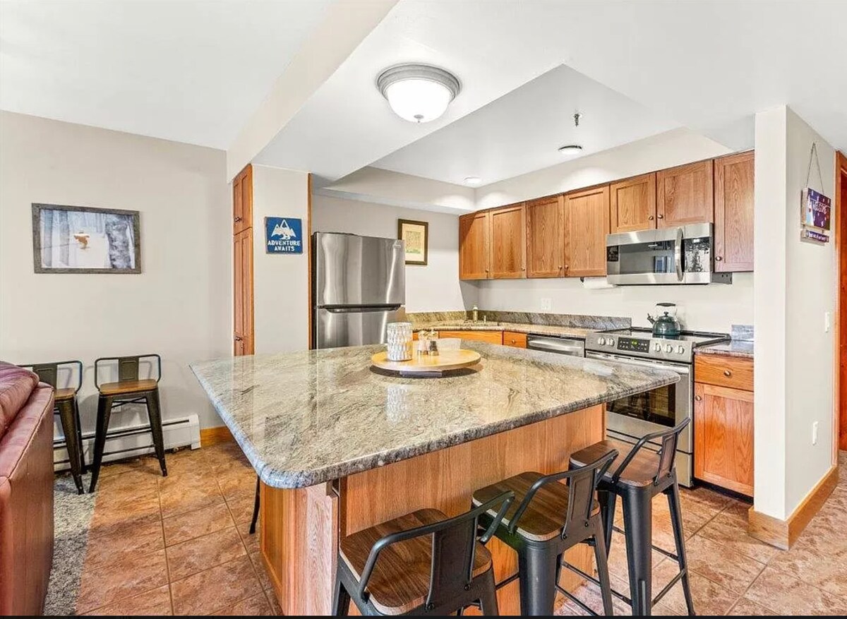 ⭐️«Superbe logement idéalement situé - récemment rénové, super propre et en face de la ville." ⇒ Centre de Stratton Village, à distance de marche des restaurants, des boutiques et des ascenseurs 🚶♂️🏔⇒ Balcon privé avec vue imprenable 🌅⇒ Espace de travail dédié Cheminée 📝⇒ à gaz 🔥⇒ Cuisine de chef entièrement équipée Parking👩🍳⇒ central AC/Heat ⇒ Onsite pour 1 véhicule 🅿️⇒ Prestations communautaires: piscines, jacuzzis, sauna, centre de remise en forme, court de tennis, sentier de randonnée, laveuse/sécheuse ⇒ 67 mbps Wifi