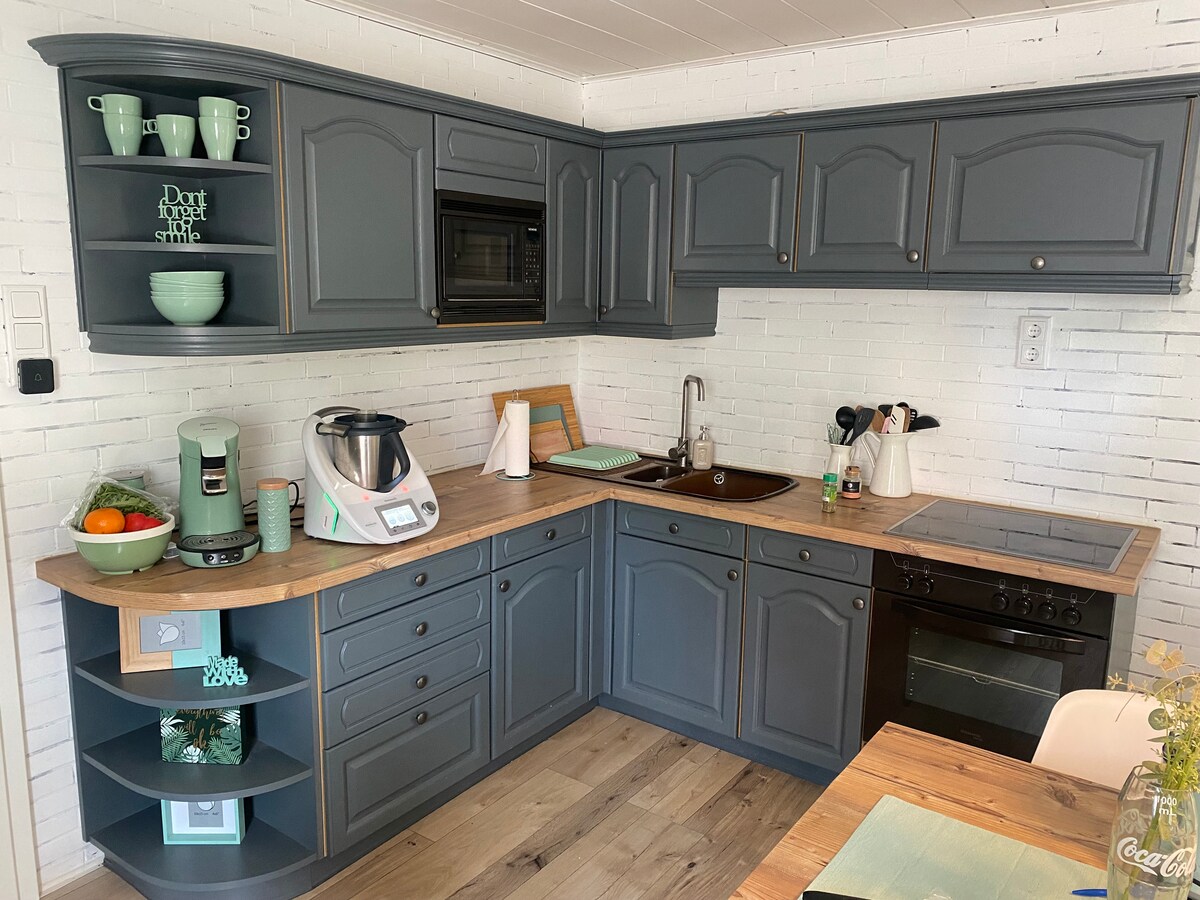 Appartement mignon, charmant, lumineux et confortable avec une grande cuisine, 2 chambres, un salon et un balcon donnant sur le jardin. La salle de bain avec douche et fenêtre est carrelée, le reste de l'appartement a du parquet en bois rustique. L'appartement de 65 m² est situé au rez-de-chaussée d'une maison de deux familles. Un parking est disponible. Arriver simplement et se sentir à l'aise.
