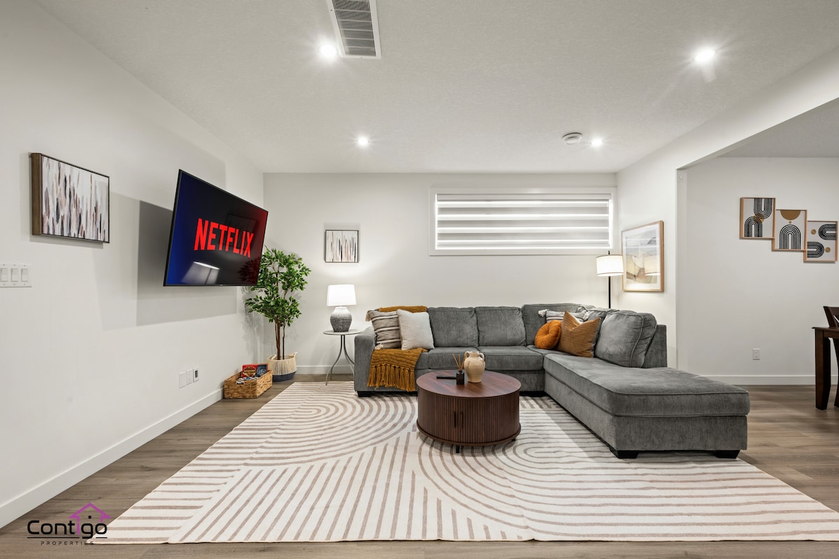 Bienvenue chez vous loin de chez vous ! Notre belle suite au sous-sol de 2 chambres offre le mélange parfait de confort, de style et de commodité. Que vous soyez en ville pour affaires ou loisirs, cette retraite paisible offre tout ce dont vous avez besoin. Le logement comprend un lit king size et plus de 80 équipements soigneusement sélectionnés dans divers espaces, y compris une cuisine bien équipée, un salon confortable, des chambres relaxantes et une salle de bain impeccable. Vous vous sentirez comme chez vous pour des séjours courts et longs