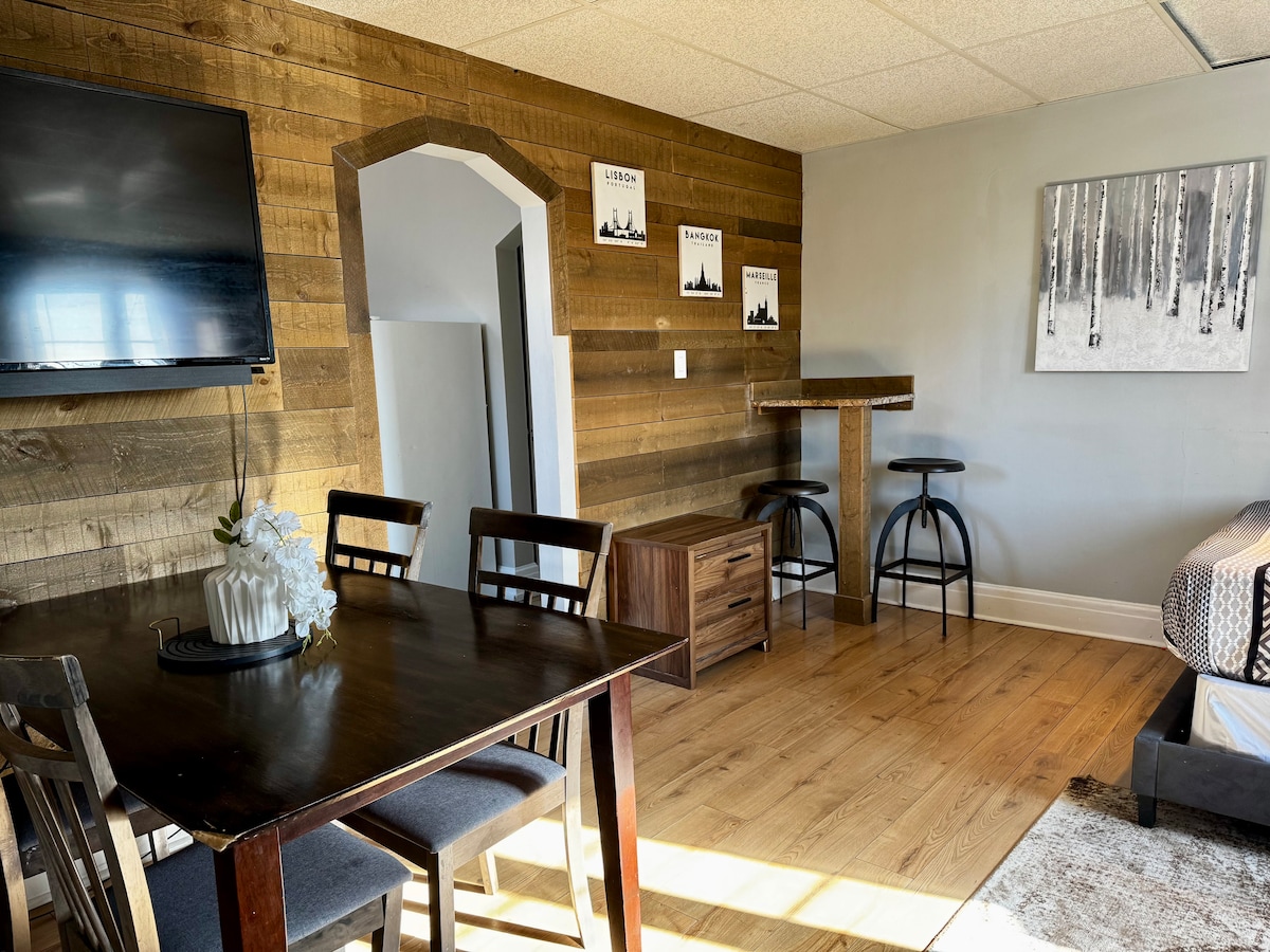 Évadez-vous dans un studio lumineux et bien conçu de JD Suites, où chaque détail est pensé pour le confort. Cette retraite compacte dispose d'un lit queen moelleux, d'une cuisinette complète avec réfrigérateur et ustensiles de cuisine, et d'une salle de bain moderne. Parfait pour les voyageurs en solo ou les couples, profitez de la télévision en continu, de l'espace de travail et de nos commodités exclusives JD Suites. À quelques minutes des magasins, des restaurants et des attractions. Une base confortable pour explorer Sudbury avec style. Idéalement situé pour votre commodité.
