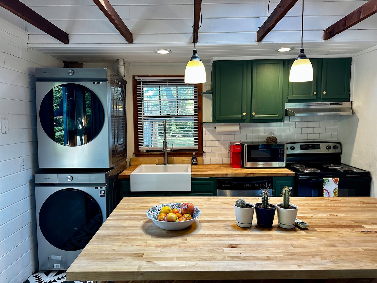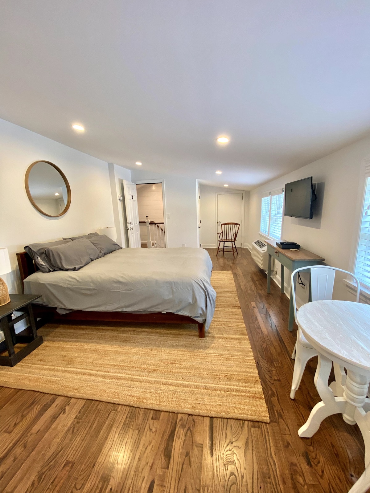 Profitez de cet appartement loft de 2 chambres et 2 salles de bain récemment rénové situé au centre du village de Greenport. À 5 minutes à pied de Front Street, des commerces de Main Street, des restaurants, des bars et en face du parc/aire de jeux. Terrasse arrière privée pour les repas en plein air et un porche avant couvert pour un verre de vin ou un café le matin. Stationnement pour 2 voitures de taille moyenne dans l'allée. Prise de courant disponible pour les véhicules électriques. Cour privée avec barbecue, foyer, chaises adirondack, pelouse et salons pour bronzer, lire ou faire une sieste.