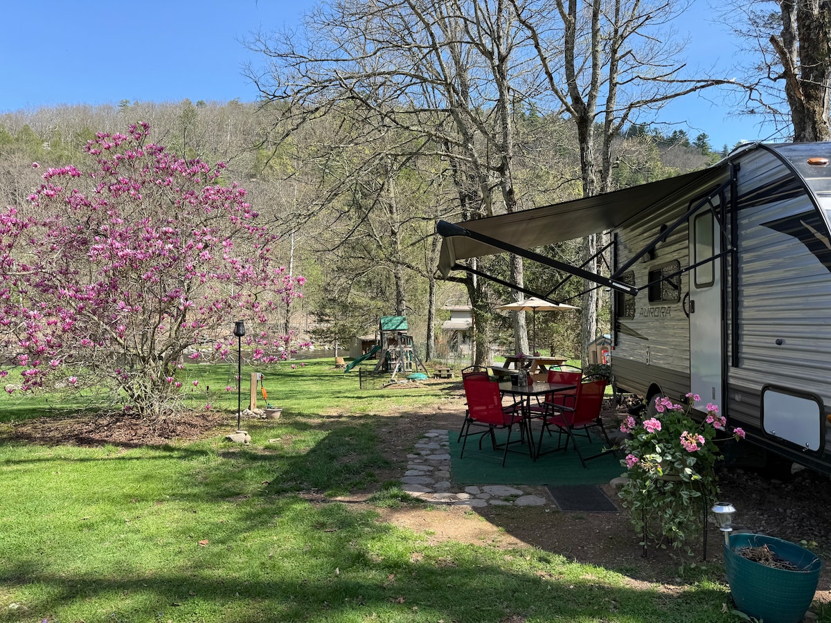 Notre magnifique et spacieuse ROULOTTE de 26 pieds est parfait pour une famille ou un groupe d'amis. Situé sur 38 acres de sentiers forestiers, il fait partie du Point of Infinity Retreat Center, où règnent la paix, le calme et la détente. Il est recommandé de faire un barbecue. Cuisine très bien équipée. 2 bains d'eau chaude partagés (douches chaudes/froides, éviers et toilettes toute l'année) ne sont qu'à quelques pas. Un excellent logement pour les excursions dans les Catskills. Venez pour la fin de semaine ou pour une semaine!
