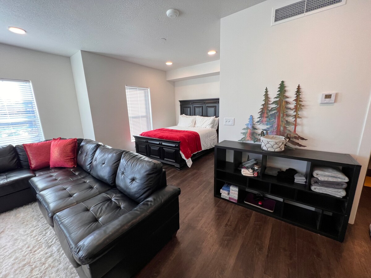 Nous serions ravis de vous accueillir dans notre appartement Studio avec lit queen size et canapé-lit queen size pour accueillir confortablement 4 personnes. Beaucoup de lumière naturelle et de vues - les fenêtres ont TOUTES des stores déroulants pour l'intimité. Placard verrouillé pour skis, vélos ou bagages. La cuisine est entièrement équipée avec des fournitures de cuisine. La communauté comprend des éclaboussures, des terrains de football, un terrain de jeu, des sentiers de promenade et des pistes cyclables. Transport gratuit dans Park City via High Valley Transit.