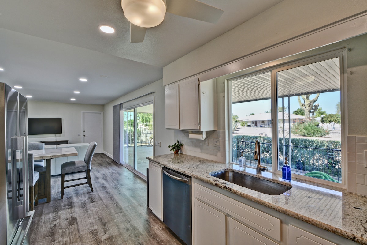 Maison rénovée de 2 chambres et 1 salle de bain à Sun City. La maison dispose d'une cuisine gastronomique avec des comptoirs en quartz et des appareils électroménagers en acier inoxydable. Comprend un bar à café complet. Attendez de voir la cour arrière avec le vert de putting. Situé à proximité de la 101, du Cardinals Stadium, du casino, du centre commercial, du golf, des divertissements et des magasins. Les deux canapés du salon se convertissent en lits simples qui peuvent accueillir 2 personnes supplémentaires. Remarque : la buanderie est partagée avec la casita à l’arrière. Téléviseurs intelligents dans le salon et dans les chambres