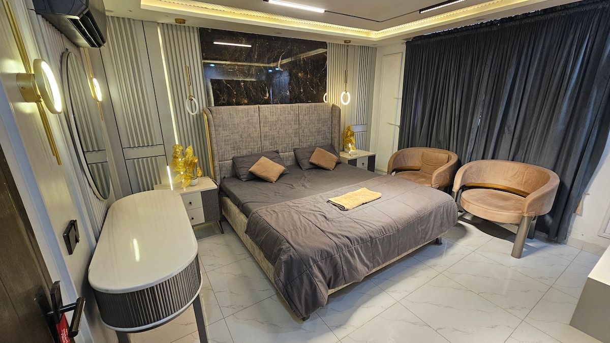 Bienvenue à The Aura Stays — comme à la maison, mais en mieux. Studio moderne et confortable avec un très grand lit, des sièges de canapé en cuir, une télévision intelligente avec Netflix et une connexion Wi-Fi rapide. Profitez d'une vue imprenable, d'un éclairage doux et d'une décoration élégante. Comprend une cuisinette compacte avec une bouilloire et une salle de bain propre et moderne. Situé dans un immeuble sécurisé au cœur de Bahria Town, à proximité des cafés, des parcs et des sites touristiques. Parfait pour les voyageurs en solo, les couples mariés ou les séjours d'affaires. Réservez maintenant pour profiter de confort, de style et de tranquillité.