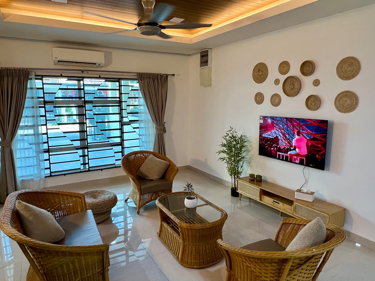 Bienvenue à la suite Calme Luna, avec 4 chambres et une superbe piscine en face. Située à une courte distance du centre-ville et des attractions de Kuala Terengganu, notre maison offre le mélange parfait de luxe et de confort pour votre escapade. Entrez pour découvrir un intérieur moderne avec de nombreux espaces intérieurs et extérieurs conçus pour la détente et la socialisation. Le séjour ouvert est parfait pour les réunions de famille, avec des sièges confortables et un coin repas où vous pourrez déguster des repas ensemble.