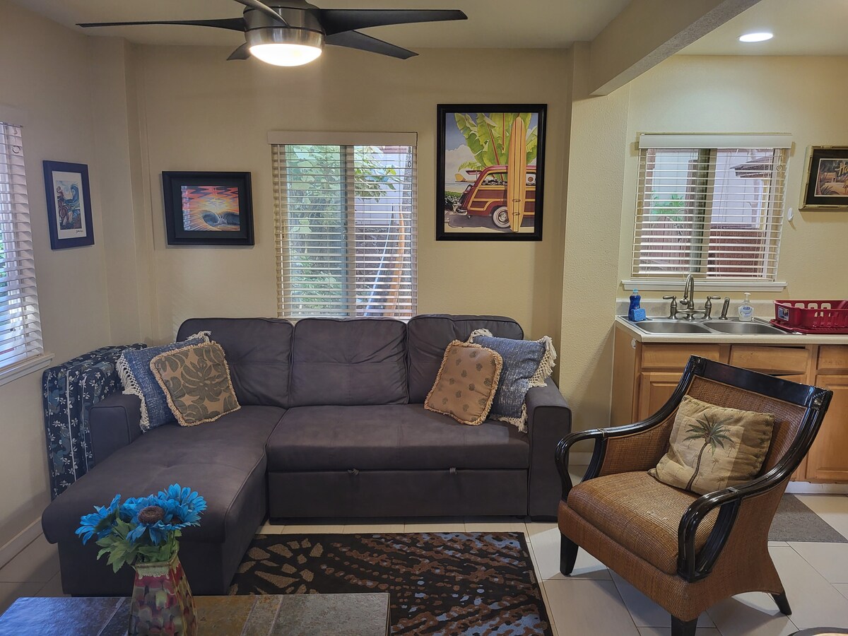 Récemment construite, notre suite super privée est située à Sunset Beach, sur la côte nord d'Oahu. À quelques pas de la plage et de Ted 's Bakery. Le stationnement est gratuit et juste à côté de chez vous. La kitchenette et la salle de bain sont intégralement équipées. Nouveaux appareils électroménagers, des stores, un matelas, des draps, des serviettes et un climatiseur partagé très calme ! Nous ne louons que 30 jours afin de nous conformer à la législation locale sur la location de courte durée.