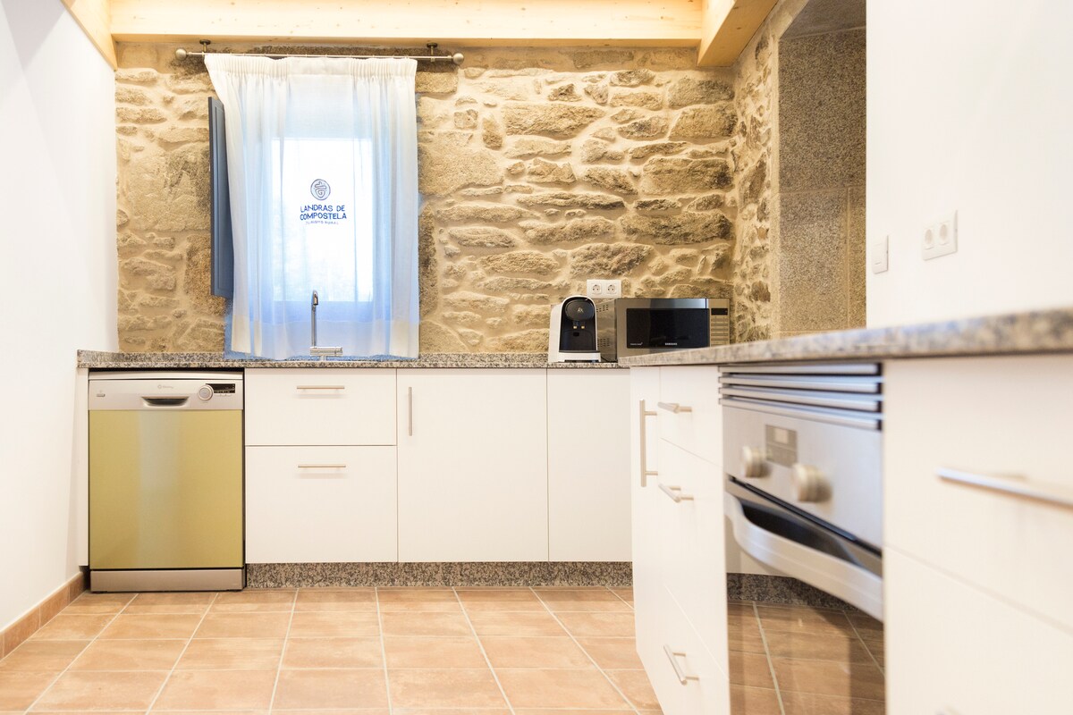 Logement au rez-de-chaussée, à 10 minutes de route de Santiago et à 20 minutes de la plage, situé dans un environnement naturel et calme, à seulement 1 km de l'autoroute AG-56 Santiago-Brión, ce qui permet d'accéder facilement aux zones touristiques de Galice, ainsi qu'aux services de supermarché et de restauration de la région. Il dispose de 3 chambres, 2 salles de bains, cuisine-salon, terrasse vitrée, barbecue couvert et jardin, entièrement équipé avec linge de lit, serviettes, ustensiles de cuisine et wifi (600 Mo).