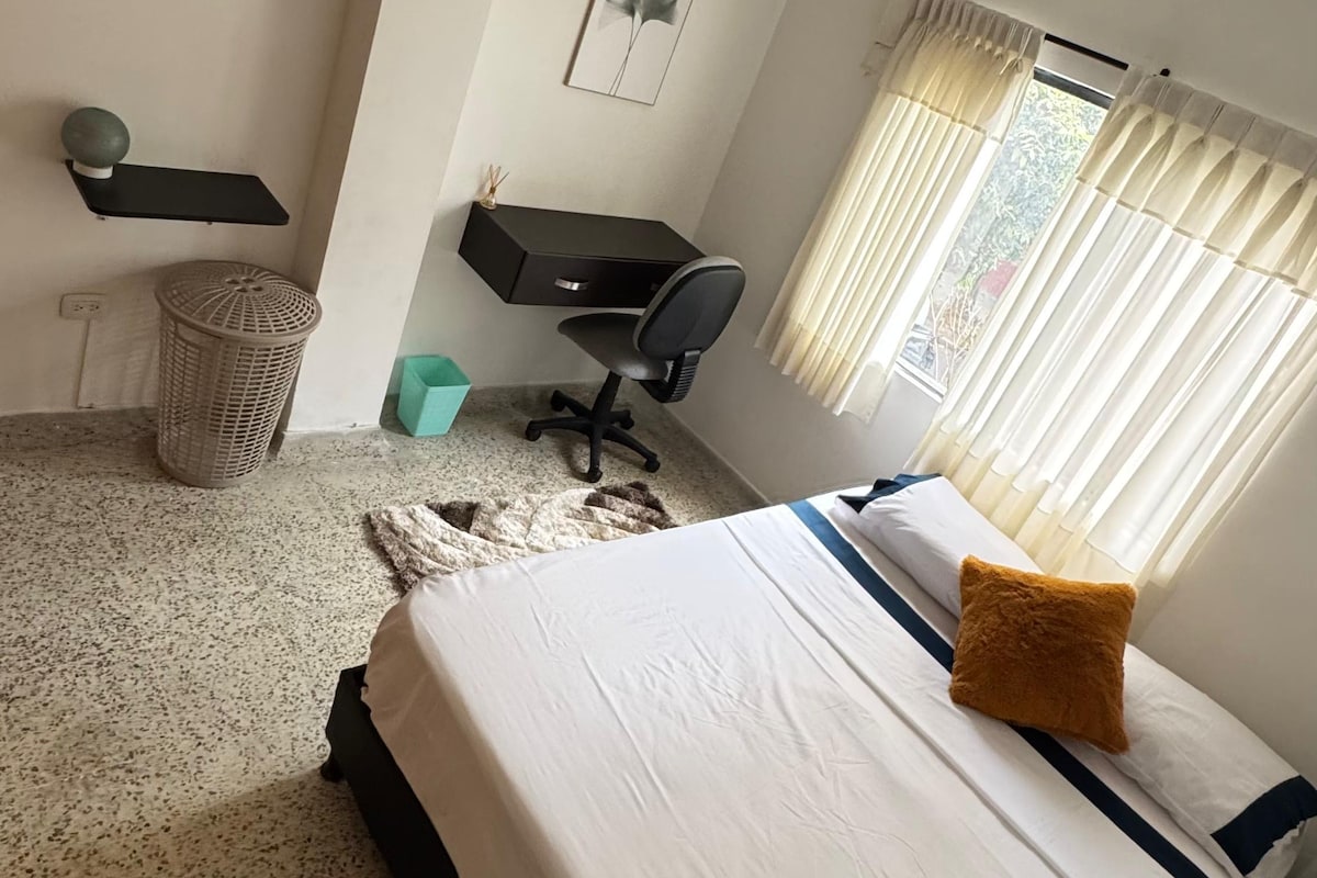 Studio spacieux, excellent emplacement, à deux rues de Papelería Panamericana et à trois rues de la clinique San Luis. Le secteur est très calme et accueillant. Il dispose de l'eau chaude, wifi de 180 Mégas, TV par câble avec 86 chaînes en HD, Smart TV de 43 pouces, planche à repasser, fer à repasser, lave-linge, mixeur et ustensiles de cuisine, entre autres. Deuxième étage sans ascenseur. Tout est à proximité.