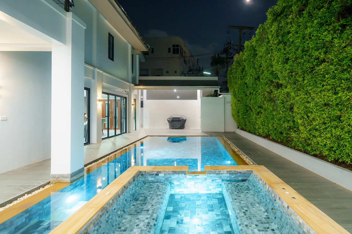 Villa design moderne de 4 chambres, à 7 minutes à pied de la plage de Surin et à 10 minutes de la plage de Bang Tao. Clubs de plage, restaurants, terrains de golf et zones commerçantes à proximité. Salon avec Netflix et 4 lits/salles de bains attenantes. Salle à manger pour 10 personnes. Grand étang de carpes Koi avec cascade et salle de massage dans l'un des plus beaux jardins de Phuket. Intérieur de style asiatique, influencé par Ralph Lauren. Profitez de la piscine tropicale partagée de 33x8 m de forme libre. Personnel amical pour le petit-déjeuner et le nettoyage/linge de lit.