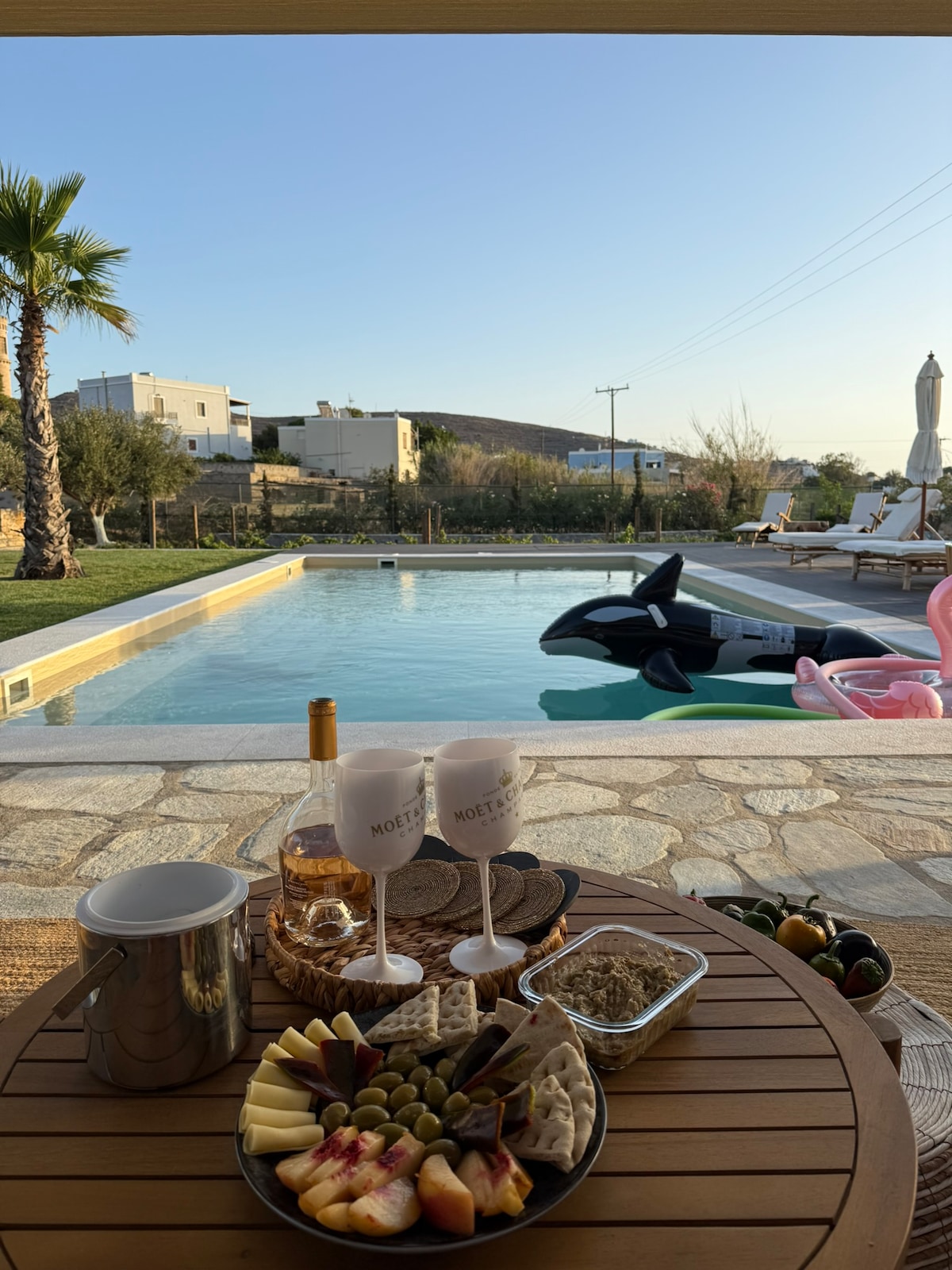 Our suite is designed with cycladic and bohemian style. It features handmade furniture and top quality fabrics and equipment. It have an infinity pool with sea salt and a small pool in front of the suite. Enjoy the breathtaking sea view drinking a glass of wine. The suite is located in Megas Yialos Syros. You can also book your private chef experience with our michelin star experienced owner. We are looking forward to meet and host you!