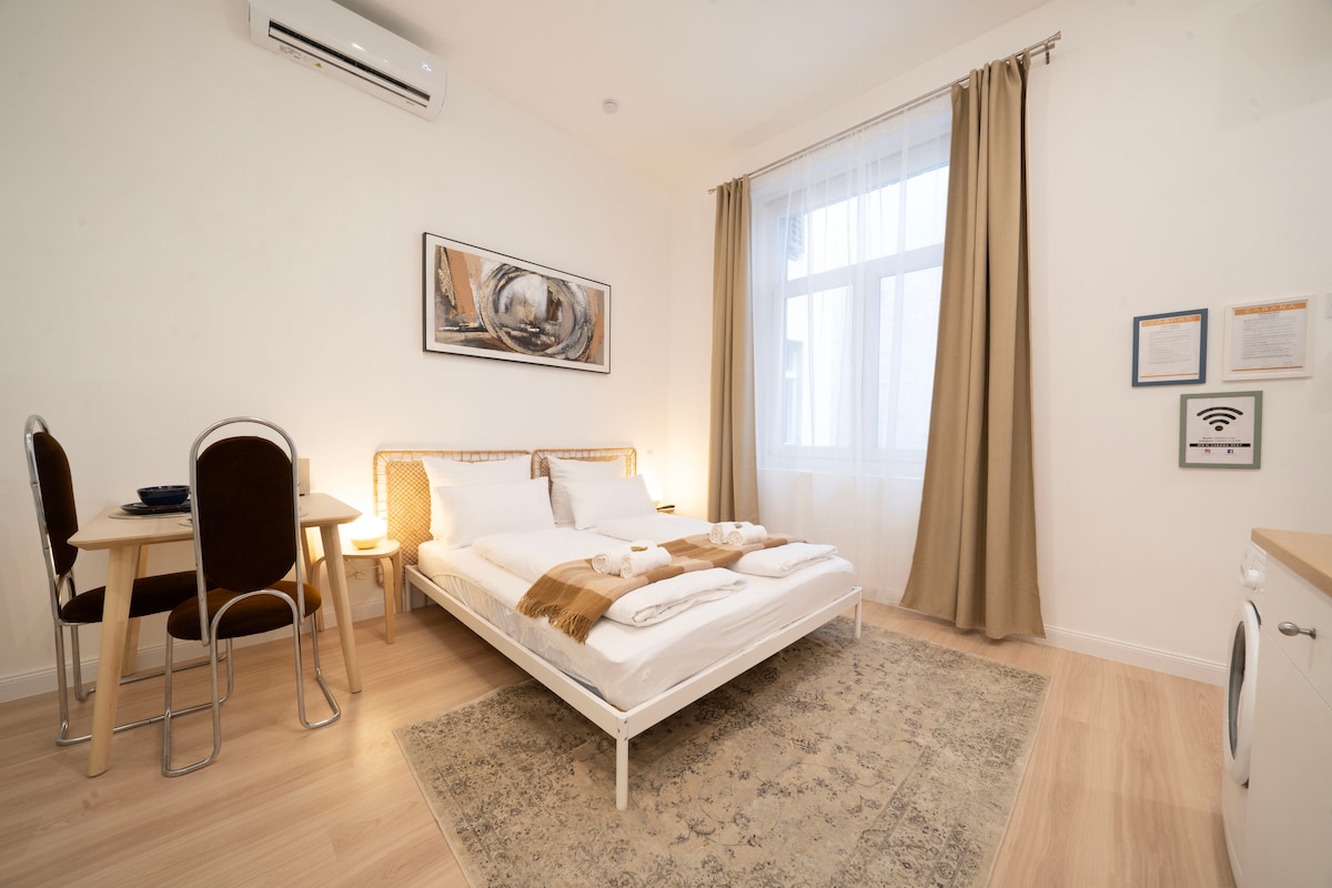 Détendez-vous et détendez-vous avec style dans ce studio super central, au cœur de la ville, mais surtout ! Vue imprenable sur la ville depuis le toit-terrasse, où vous pourrez profiter du soleil chaud de l'été, du temps nuageux ou regarder la neige tomber sur la ville. Prenez un expresso ou un verre de rose ici avant de commencer votre grande journée de Budapest ! Le stationnement à Budapest peut être un cauchemar, mais j'ai récupéré vos arrières, car l'appartement dispose de votre propre place de stationnement sûre dans un garage privé à 1 minute de votre logement !
