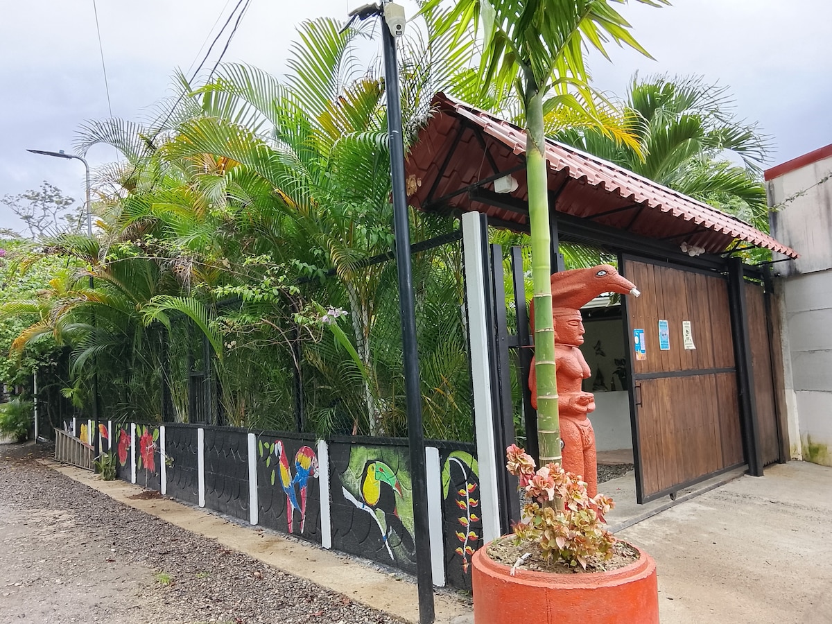 Maison spacieuse de deux chambres dans la jungle à Cocles, à seulement 7 minutes de la plage. Située sur une grande propriété avec un jardin potager, un accès à la rivière et un foyer, c'est le parfait mélange de confort et de nature. La maison dispose d'une cuisine entièrement équipée avec lave-vaisselle, ventilateurs partout. Douche d'eau chaude, 1 lit king size et un lit double (lit simple supplémentaire disponible si nécessaire. Les animaux de compagnie sont les bienvenus. Idéal pour les familles, les couples ou les amis à la recherche d'une base confortable entourée de jungle mais proche de la mer.