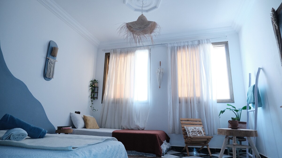 Découvrez un refuge spacieux et lumineux au cœur de Tamraght. Idéal pour les groupes ou familles, cet appartement entier allie confort boutique et indépendance. Cuisine équipée, propreté méticuleuse et ambiance sereine : tout est pensé pour le repos. Profitez d’une vue imprenable sur l’Atlantique et accédez à notre rooftop partagé pour vos moments de yoga ou un café au coucher du soleil. Le compromis parfait entre intimité et esprit de voyage.