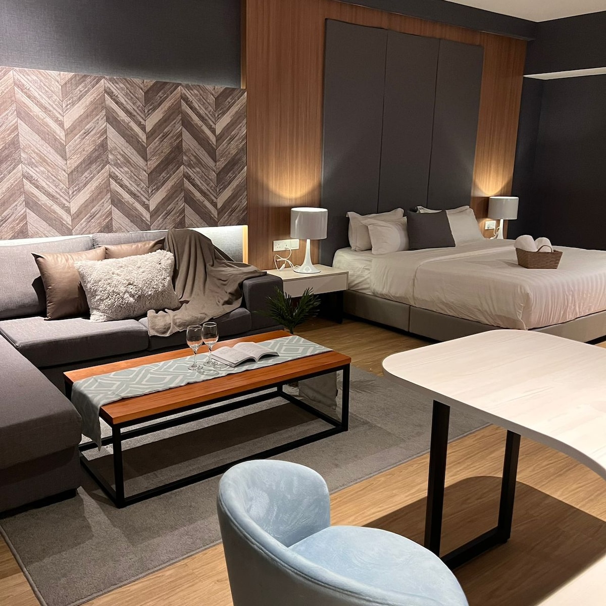 Laxzone at Aru Suites, située dans la vieille ville de Tanjung Aru. Cette suite offre une vue magnifique sur le coucher du soleil depuis le balcon. L'intérieur nordique dégage un sentiment de chaleur et de charme tout en conservant un côté moderne. C'est un endroit parfait pour séjourner lorsque vous voyagez à Kota Kinabalu.