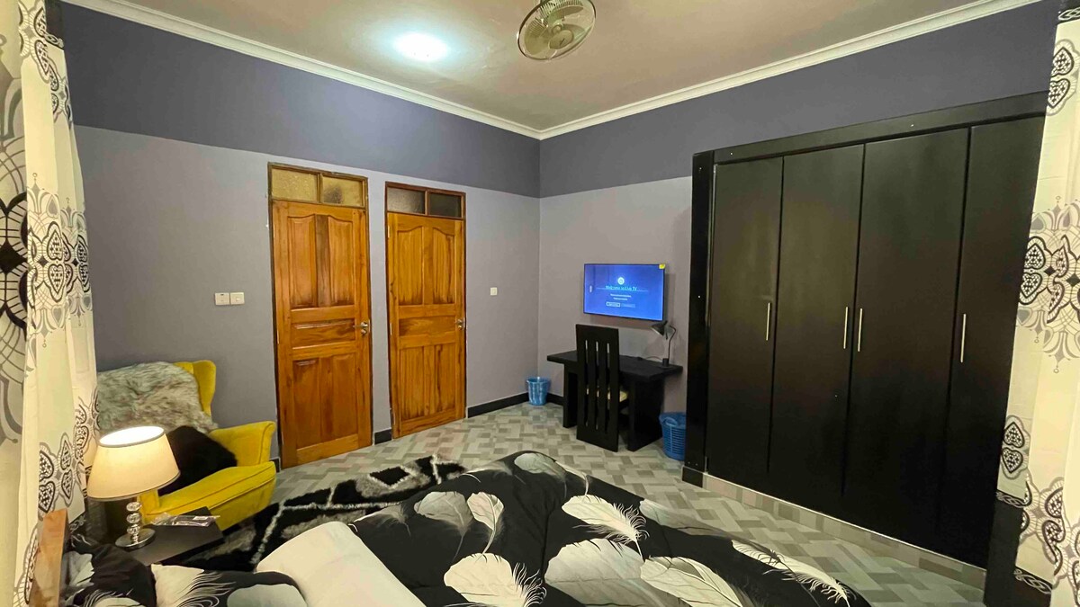 Profitez de l'élégance de l'époque contemporaine qui séjourne dans ce logement moderne. Magnifiquement décoré et doté d'un escalier, d'un mobilier d'époque et d'une salle de bain carrelée noir et gris de style éunique. Il est à environ 15 minutes en voiture du centre-ville de Mwanza et à environ 20 minutes de transfert en voiture depuis l'aéroport de Mwanza. La réservation de la maison est de 2 chambres pour un portail parfait en famille et entre amis.
