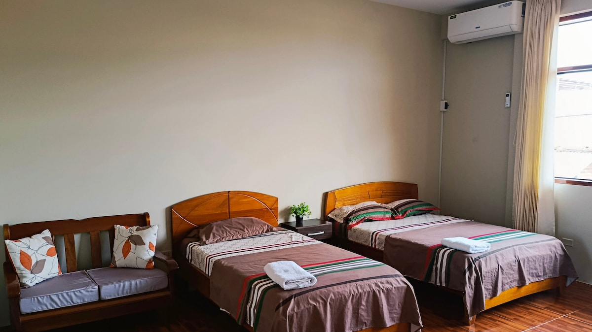 Mini-maison de style « chalet », chaleureuse et confortable, idéale pour les couples et les familles avec enfants. Lumière naturelle et grandes fenêtres avec moustiquaire et rideaux, ventilateurs aux deux étages, une petite cuisine-salle à manger avec cuisinière à gaz à 2 feux, ustensiles et matériel de cuisine de base. 01 Salle de bain avec eau chaude au premier étage. Au deuxième étage : 01 téléviseur avec service de câblodistribution et 02 ou 03 lits simples. Au cœur de la nature. Située en ligne droite depuis la Plaza de Tarapoto, à 5 minutes en mototaxi 🛺.