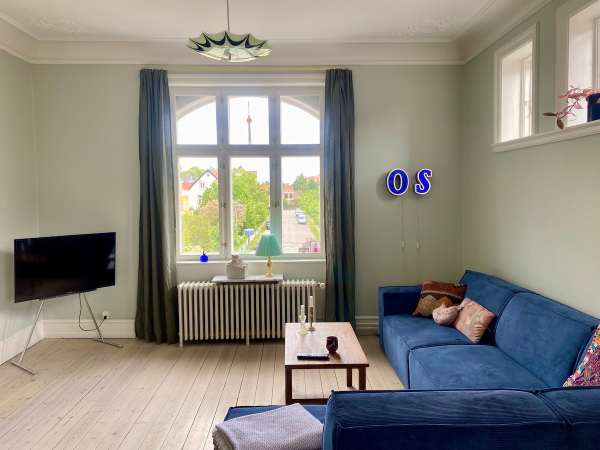 Appartement lumineux et accueillant au 5e étage avec de belles vues et un emplacement calme au milieu d'un environnement verdoyant. Proche du métro, de l'université et de DR Byen – à seulement 2 arrêts du centre-ville. L'appartement dispose de toutes les commodités modernes, y compris une cuisine entièrement équipée, un lave-linge et une connexion Wi-Fi. La décoration est personnelle et caractérisée par un design scandinave avec des touches créatives, parfait pour vous qui appréciez l'esthétique, le confort chaleureux et une base centrale mais paisible dans la ville. Il y a un ascenseur dans l'immeuble.