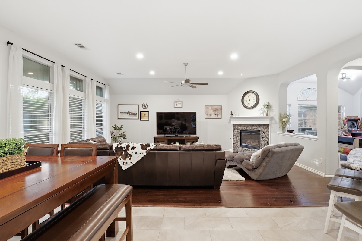 Ce logement spacieux est idéalement situé à Grand Prairie, au Texas, avec un accès facile aux centres commerciaux et aux principales attractions. Avec un peu plus de 3 300 pieds carrés d'espace de vie, cette maison peut accueillir jusqu'à 12 personnes avec 5 chambres à coucher et 3 salles de bain complètes. En outre, un bureau privé, un salon de boue, plusieurs espaces de divertissement, un piano et une connexion Internet haut débit. Ce logement est parfait pour des réunions de famille ou pour des voyages d'affaires. À proximité des principales attractions. Bienvenue à la Brazoria House of Grand Prairie !