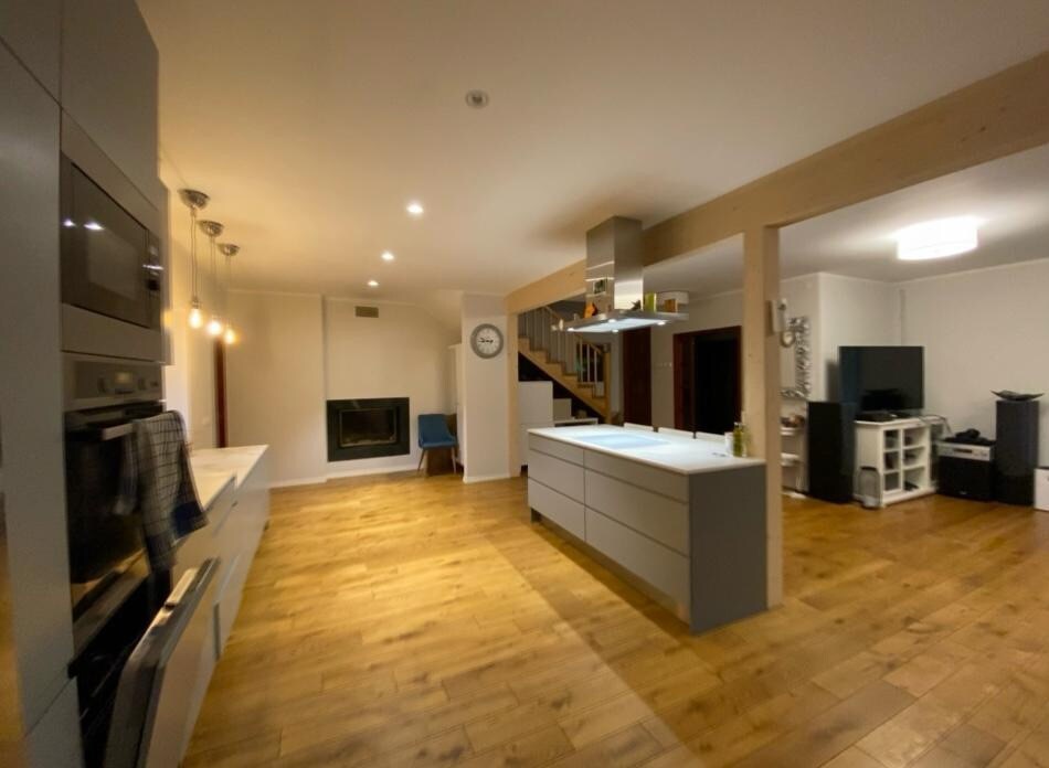 2 étages, plan ouvert, petite cabane. Haut - peut accueillir 4 personnes. (2 matelas) Canapé pliant : 2 po. Réfrigérateur, plaque de cuisson à induction 2 places, four de cuisson, lave-vaisselle, cheminée - poêle à bois, pompe à chaleur à source d'air. Également la maison chaude en hiver. Douche+ chauffage par le sol dans la salle de bain. Patio. Sauna en baril : 70 € de plus. Gril : apportez du charbon de bois, autre fourni. Aire de jeux pour enfants, trampoline, balançoires, tyrolienne, maison de jeu, cour pour la course à pied. Nous avons un petit chien, un mini lapin, des poules. Les familles vivent dans la maison d'à côté.