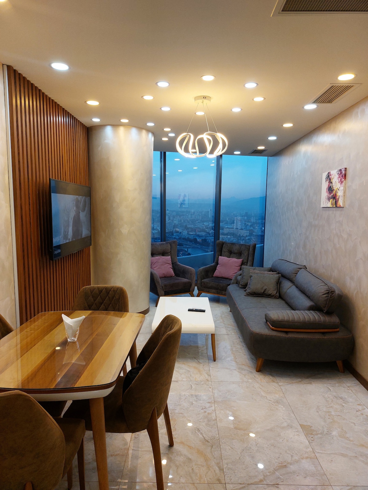 L'appartement que vous êtes assuré d'aimer ! Découvrez le confort et le luxe de cet appartement situé au 20e étage au centre de Tbilissi. Profitez d'une vue panoramique depuis votre lit et votre salon. Avec des équipements haut de gamme et des services supplémentaires au sein du complexe, votre séjour sera inoubliable. ** N'oubliez pas que l'accès à la piscine et au club de remise en forme n'est possible qu'en payant les frais d'adhésion au centre de bien-être Axis Towers. **