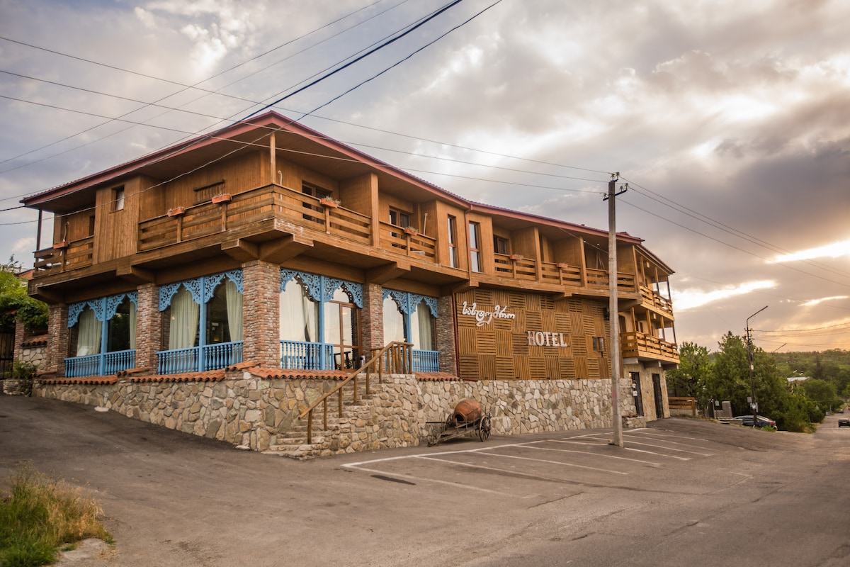 L'hôtel est situé au centre de Telavi, tous les sites touristiques de la ville sont à une courte distance. Toutes les chambres disposent de leurs propres équipements. L'hôtel dispose de meubles anciens, de plafonds peints par des artistes, d'une cheminée et d'une table de billard au troisième étage. Depuis le balcon, vous pourrez profiter d'une vue magnifique sur les montagnes du Caucase, la vallée d'Alazani et une partie de la vieille ville. Nous sommes ravis de vous accueillir et de rendre votre séjour dans notre hôtel inoubliable et confortable