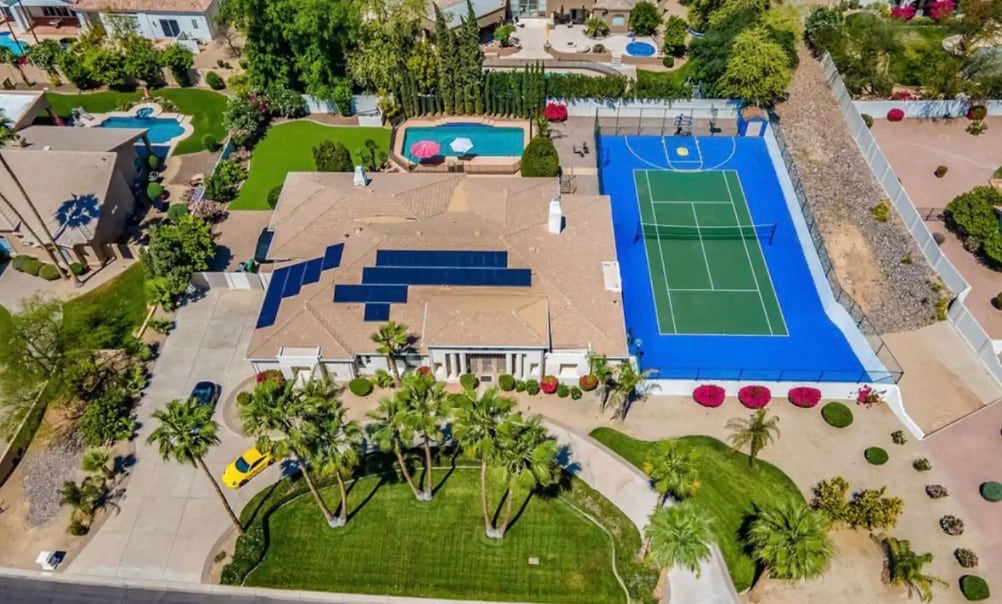 ** LE TARIF DE BASE DE L'ANNONCE EST POUR 12 PERSONNES (8 LITS, 4 CHAMBRES) ; la chambre bonus peut accueillir 5 personnes supplémentaires avec 4 lits supplémentaires (17 personnes, 12 lits, 5 chambres au total) -- peut être ajoutée pour 295 $/nuit + taxes ** Oasis adaptée aux groupes, à 15 min du centre-ville de Scottsdale. Grand jardin avec belvédère, piscine privée, terrains de basket-ball et de volley-ball, terrain de football et putting green privé. Salle de jeux intérieure : jeu d'arcade pour 4 joueurs avec 3 500 jeux, flipper avec 337 jeux, course automobile assise, baby-foot et plus encore!