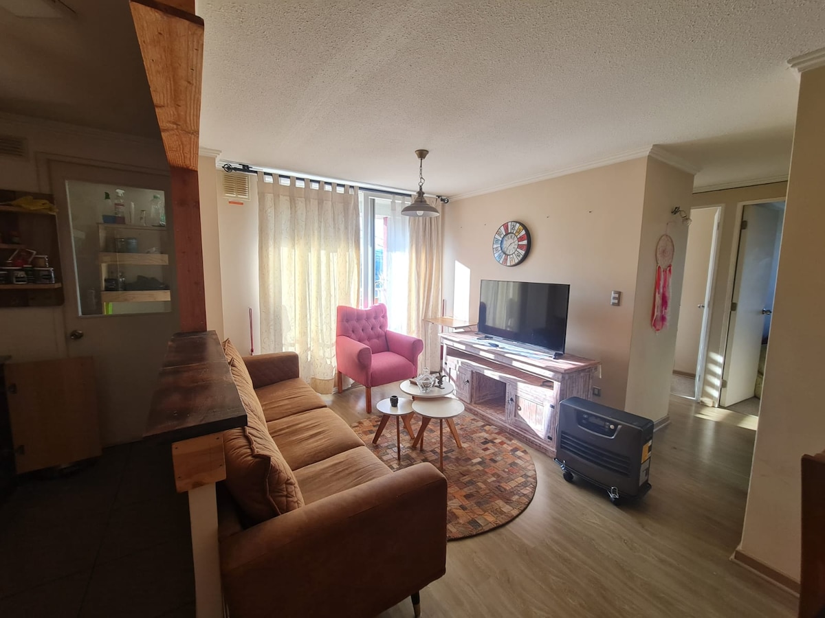 "Refuge Confortable au Coeur de Temuco" Appartement en plein centre ville, à quelques pas des principaux services. Il dispose de : - 1 chambre avec lit king convertible en deux lits de place - Smart TV dans la pièce et le salon - Wi-Fi haute vitesse - Cuisine et salle de bain équipées - Balcon avec maillage de sécurité - Canapé-lit pour un troisième adulte ou deux enfants Parking gratuit à l'intérieur de l'immeuble. Parfait pour les couples et les familles. Réservez maintenant et profitez de votre séjour à Temuco !
