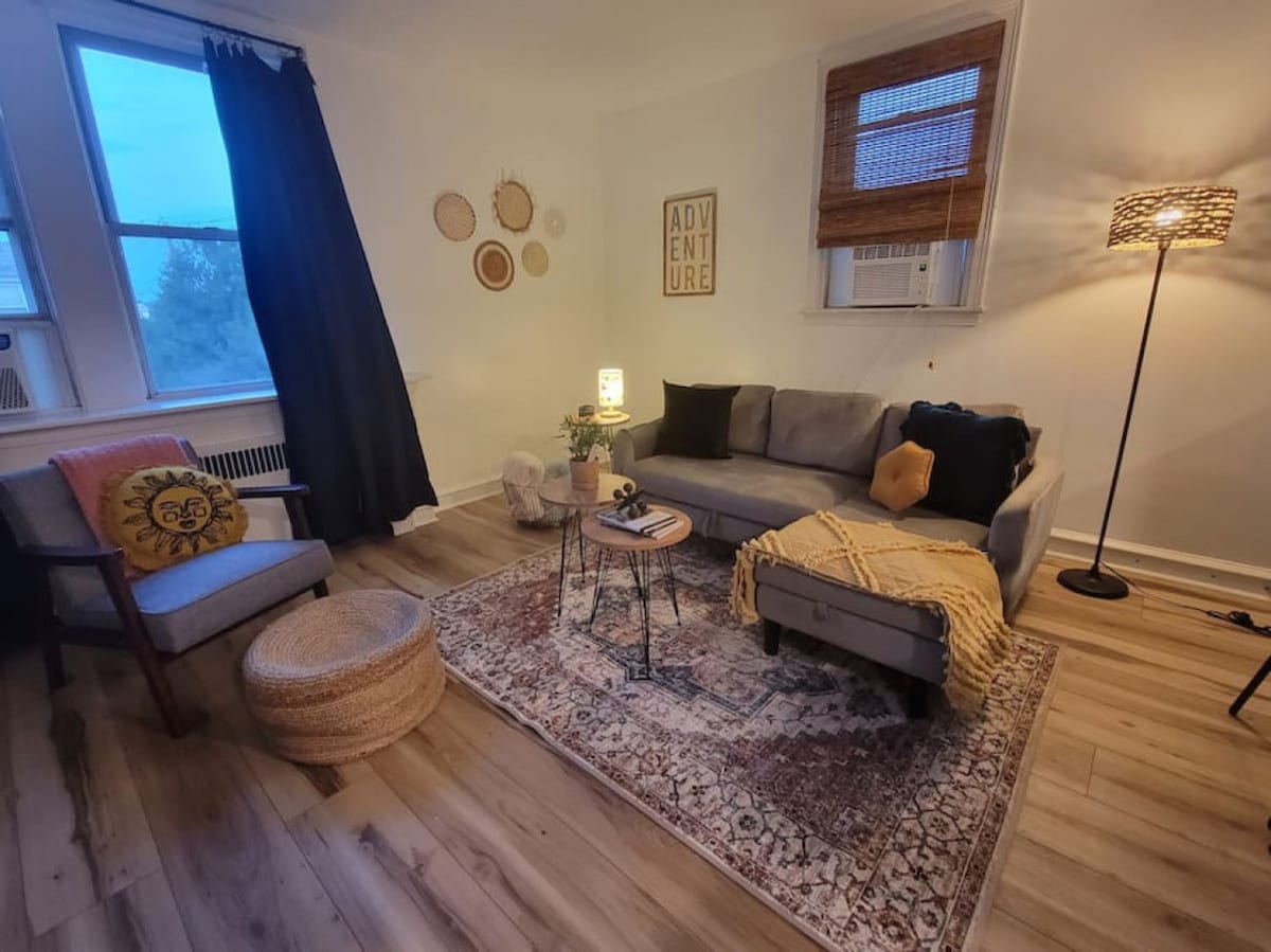 Wifi ✓ rapide 300mbps Téléchargement/téléchargement ✓ 15 minutes en voiture de Philadelphie/Aéroport Des places de stationnement✓ gratuites sont toujours disponibles dans la rue. Appartement spacieux de✓ 800 pieds carrés ! ✓ Draps et serviettes inclus ✓ Shampooing, après-shampooing et nettoyant pour le corps ✓ 2 chambres ✓ 1 salle de bain Appartement ✓ moderne avec des touches de charme de ferme ✓ Kitchenette avec cuisinière à gaz à induction four Café, thé ✓ Table à manger pour 4 personnes ✓ Salon (écran plat avec les derniers films GRATUITS) console de✓ jeu Lits✓ Queen Size ✓ Patio avec✓ jardin de chaises