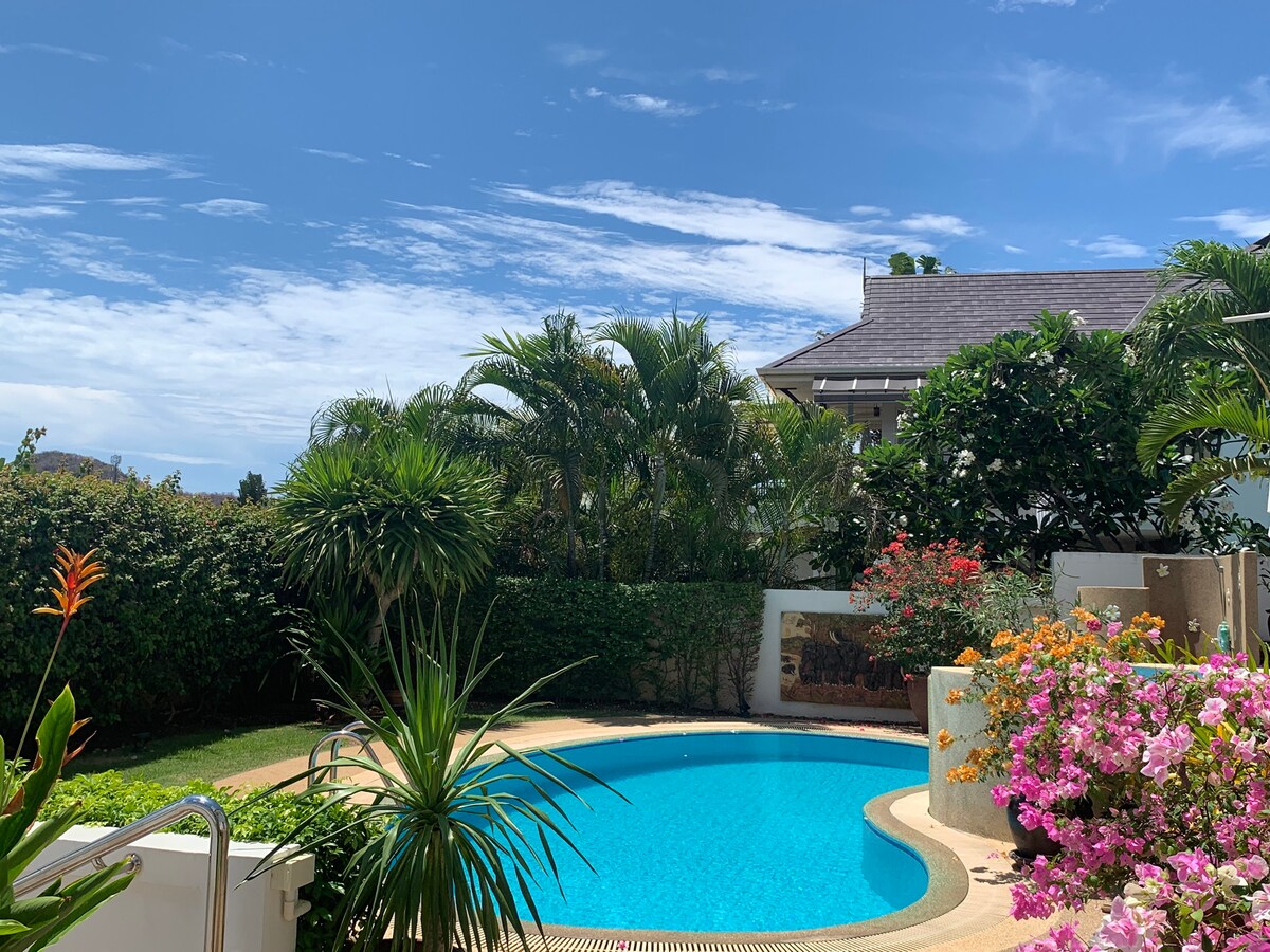 (PRIX TOUT COMPRIS) Manoir de luxe dans un complexe de villas exquis (sécurité 24h/24) dans la région de la plage de Sai Noi (100 m de Phetkasem rd). Villa de 2 étages surélevée (jardin 3 m au-dessus de la route privée) (3 chambres et 4 salles de bains ; climatisation complète), jardin privé luxuriant, piscine et 2 jacuzzis. Immergé dans la nature, bénéficie toujours d'une brise fraîche, vue sur la montagne et la mer. À 4 min en voiture de Sai Noi et de la plage de Khao Tao, à 6 min de la plage de Sea Pine et du majestueux parc Ratchapakdi. À 10 min en voiture du centre-ville. Détente idéale pour la famille, les amis et les couples.
