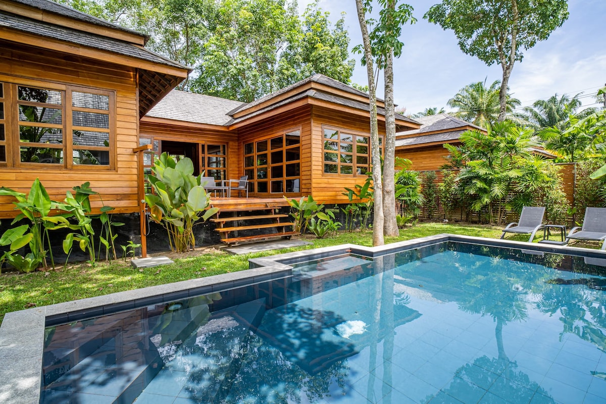 Charmante villa d'une chambre avec une décoration traditionnelle thaïlandaise élaborée. Terrasse privée donnant sur un lac, grand lit, piscine, jardins tropicaux et cuisine - idéal pour une escapade au calme. Parking et wifi gratuits. Climatisation. Enregistrement en libre-service et navette aéroport disponibles. - 8 minutes à pied du supermarché, du dépanneur ouvert 24h/24 et 7j/7, du marché frais, des restaurants, du salon de massage, de la salle de sport et de l'agence de voyages - 13 min en voiture de Layan Beach, 18 min de Surin Beach - 18 min en voiture de l'aéroport * Villas de 1 à 4 chambres disponibles*
