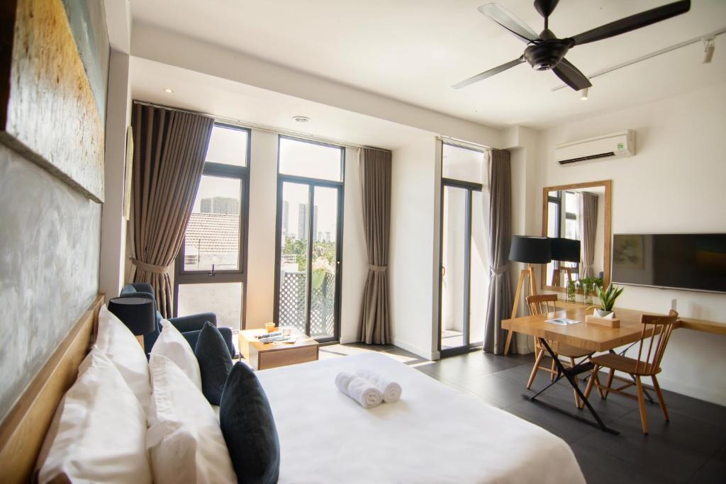 Situé dans le district 2, Kim Apartment est une élégante retraite minimaliste d'une chambre à seulement 5 minutes des cafés Thao Dien, du centre commercial Vincom Mega et de la ligne de métro 1. Il dispose d'un lit double, d'une armoire intégrée, d'un salon ouvert avec cuisine équipée et lave-linge, et d'un balcon orienté est parfait pour une vue sur le lever du soleil donnant sur une cour. Profitez d'une connexion Wi-Fi haut débit, de la télévision par câble, de la climatisation de l'onduleur, d'une sécurité 24h/24 et d'un ascenseur rapide. Votre boutique à Hô Chi Minh-Ville vous attend.