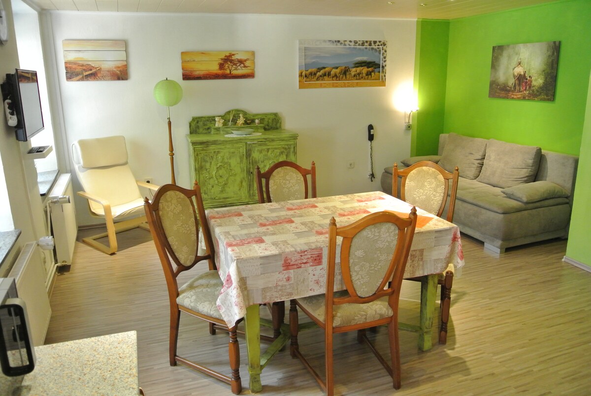 Appartement n ° 1 L'appartement de vacances non-fumeur situé à Eppelborn/Wiesbach dispose d'une entrée séparée de plain-pied. Elle convient pour 1 à 2 personnes. Convient également aux monteurs et aux professionnels en déplacement. Chambre à coucher, 2 lits simples qui peuvent également être utilisés comme lit double. Cuisine, entièrement équipée avec divers petits appareils, table à manger avec chaises, salon, canapé, télévision et Wi-Fi Salle de bain avec douche, WC À quelques minutes à pied : Commerces Médecin Pharmacie Banque Gastronomie