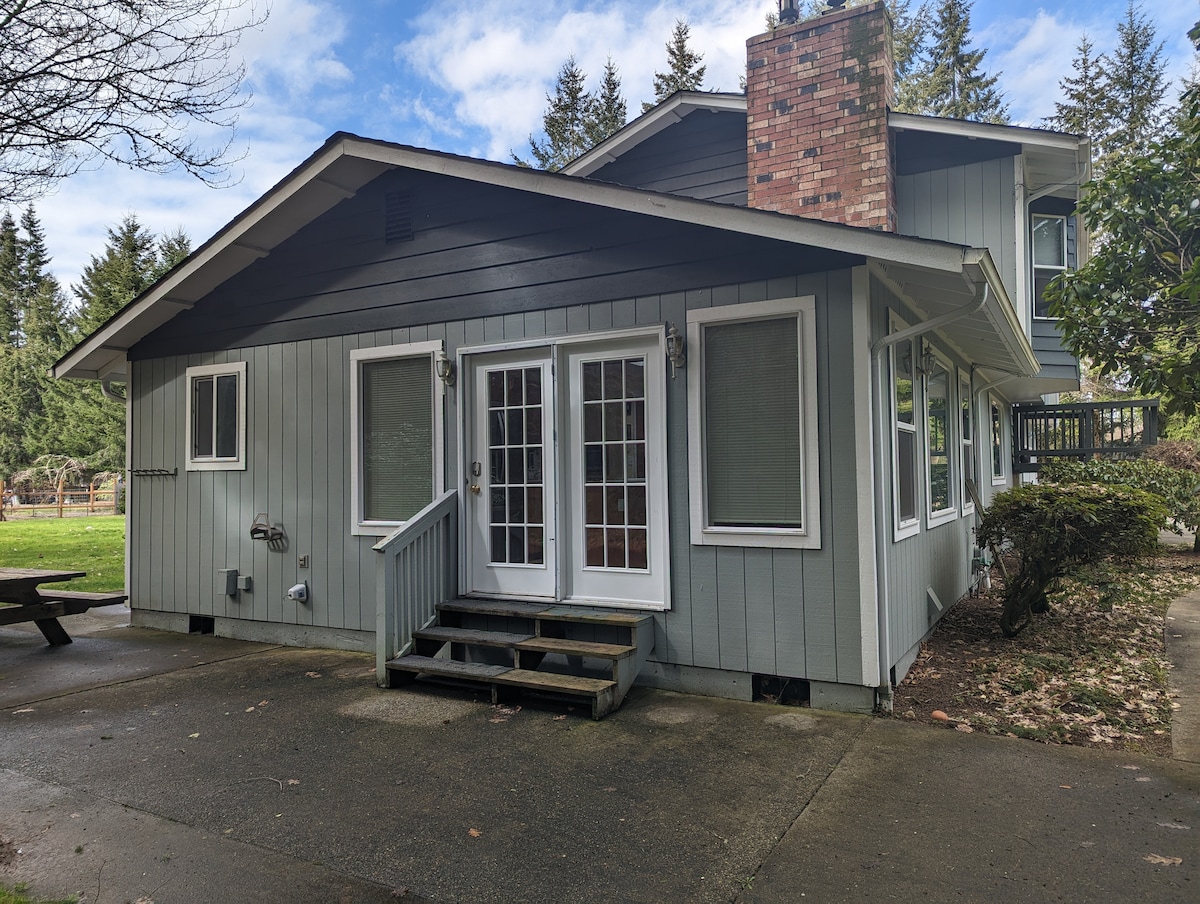 La chambre d'amis de la bibliothèque et la cuisinette de style européen sont situées dans un quartier calme de Lakewood, attenantes à notre maison. Entrée autonome avec boîte à clé, WiFi rapide, abri de voiture couvert pour le stationnement. Réductions automatiques pour les séjours à la semaine et au mois. Proche de JBLM, des magasins et de l'autoroute I-5, il convient aux escapades rapides ou aux besoins de logement plus longs. Accès à la buanderie partagée avec grande laveuse et sécheuse désinfectante. Niché dans les bois, vous pourrez vous détendre dans la suite confortable, la grande terrasse ou le terrain. Bain tourbillon disponible en saison.
