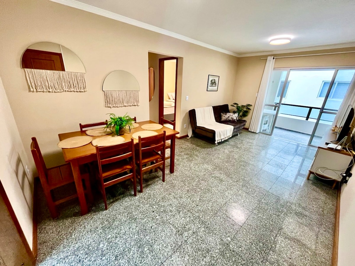 2 suítes com lavabo bem espaçosa com 80 m2. Perto de tudo(supermercado, cafeteria e etc) se quiser, nem precisa usar carro. Privacidade total(1 AP por andar c/ elevador). No imóvel têm 2 camas de casal, uma mesa de refeições, 1 colchão e 1 sofá-cama. Talheres, panelas, copos, chaleira, 1 geladeira e 1 frigobar, máquina de lavar, micro-ondas, forno elétrico e 1 filtro de água. Gás encanado, Internet 500 mb, 2 tvs. Chuveiro aquecido a gás e 1 vaga estac. Comporta até 6 pessoas.