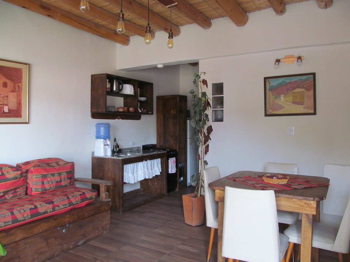 C'est une grande cabane pour cinq personnes dispose d'un lit double et de trois lits d'une place et demie avec une salle de bain avec une douche à l'eau chaude par thermo tank solaire une petite cuisine un réfrigérateur bacha et une petite piscine pour laver le linge si vous le souhaitez dans la chambre la plus spacieuse, vous trouverez les lits d'une place et dans une chambre plus petite, le lit double où se trouve également une grande fenêtre où vous pouvez voir le paysage du pucara dispose d'une rôtissoire et d'une table