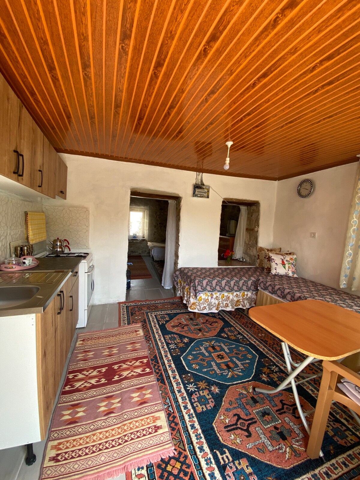 Notre maison en pierre est située en plein cœur de Bademli, à 5 minutes des baies. Il dispose d'une entrée et d'une cour séparées. Avec son grand jardin dans la cour, il offre de superbes vacances à la fois pour découvrir la vie naturelle et les belles plages. Il y a une épicerie et un boucher à côté de la maison. La maison dispose de 1 lit double et de 2 lits bébé. Peut accueillir jusqu'à 4 personnes maximum. Il y a toutes sortes d'outils dans la maison. Nous serions ravis de vous accueillir dans notre maison en pierre vintage.