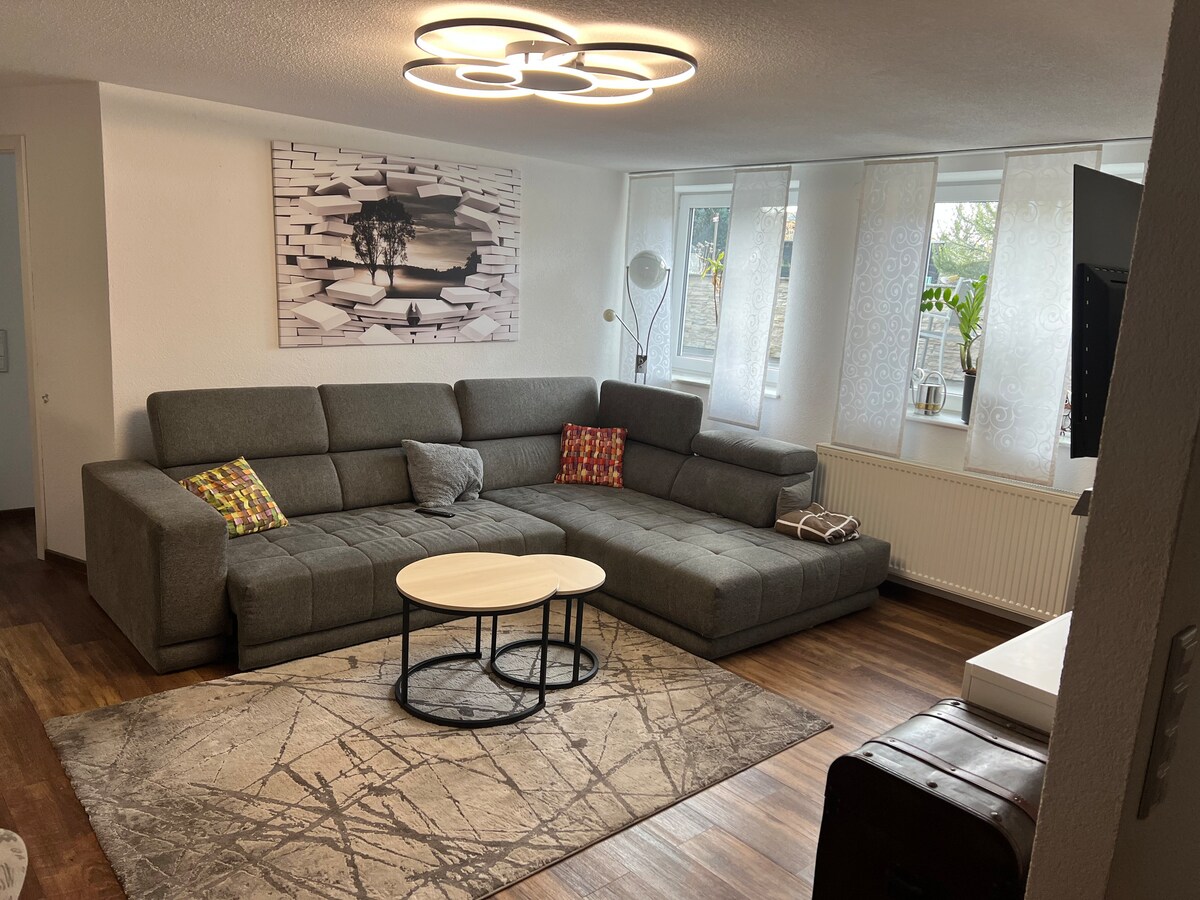 Notre appartement de vacances rénové est meublé avec amour et comprend environ 65 m². Il est au 1er étage de notre maison, dans un quartier résidentiel calme. Il dispose de 2 chambres avec lits doubles (1x190/200 ; 1x140/200), salon-salle à manger, cuisine (entièrement équipée), douche, WC, balcon, télévision par satellite, système de musique, WLAN, lit bébé et chaise haute. Places de parking à proximité. MERCI DE NOTER : Si deux invités occupent les deux chambres, nous facturons un supplément de 12 € par nuit.