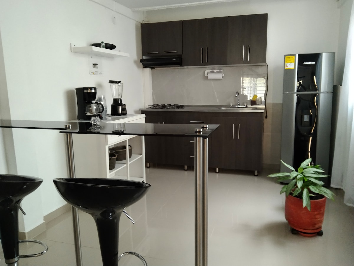 C'est un espace idéal pour se reposer, mobilier moderne, il dispose d'une cuisine avec casseroles traditionnelle , ustensiles, récipients, vaisselle, poêle, réfrigérateur, mixeur personnel Une cour de linge avec lave-linge, eau chaude, mangeur 2 places, bureau de travail, canapé, 2 placards, une alcôve indépendante avec lit double avec télévision et wifi avec directv (service exclusif pour nos clients)tout l'espace, est sûr, . Pris en charge par ses propres propriétaires. Surveillance 24 heures