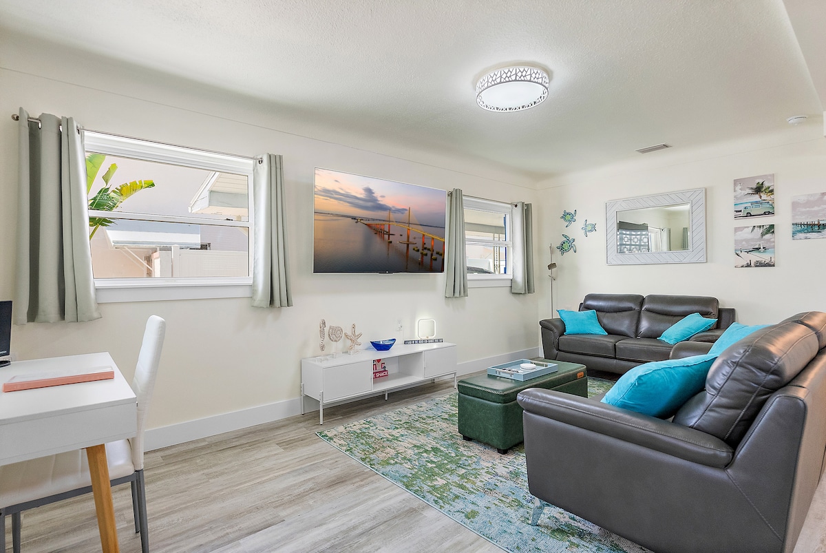 Ce logement accueillant dispose d'une cuisine entièrement équipée avec des appareils en acier inoxydable, y compris un lave-vaisselle ! De plus, profitez de votre propre lave-linge et sèche-linge ! Vous serez si proche de la belle plage, des bars et restaurants amusants... pourtant, cet espace de location est situé dans un quartier paisible. Profitez d'un porche privé, d'un parking hors rue et de bien plus encore. Le célèbre John's Pass est à seulement 1,5 miles. Vous pourrez y réserver des excursions, faire du shopping, manger et écouter de la musique live. L'unité 1 dispose d'un espace de travail dédié, de 2 téléviseurs et plus encore !