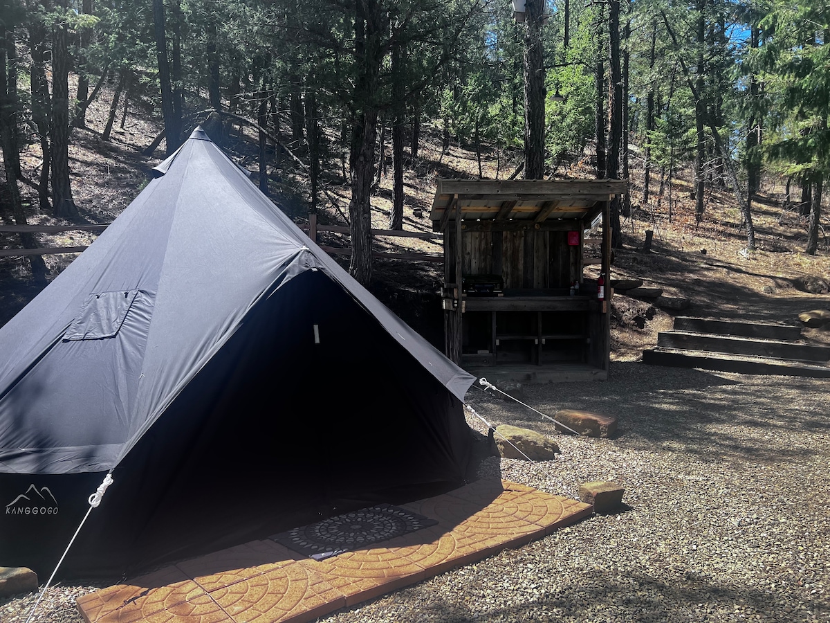 **Bienvenue à Midnight Oasis!** 🌌✨ Vivez une expérience de glamping de rêve dans notre tente Black Bell de 13 pieds au Peaceful Peaks Glamping! Admirez la vue spectaculaire sur les montagnes, préparez de délicieux repas dans votre cuisine extérieure privée et rassemblez-vous autour du foyer confortable pour des s'mores sous un ciel étoilé scintillant. Niché dans la Dark Sky Association du Colorado, c'est l'endroit idéal pour des aventures inoubliables et une observation des étoiles à couper le souffle. **Réservez votre escapade enchantée dès aujourd'hui!** 🌄💖✨